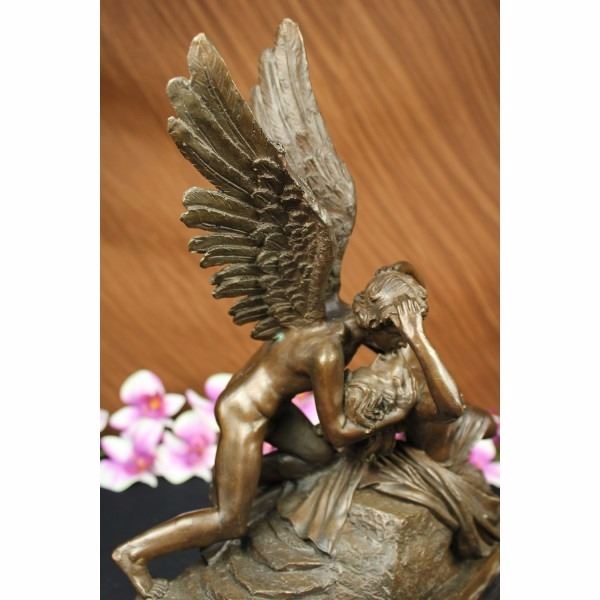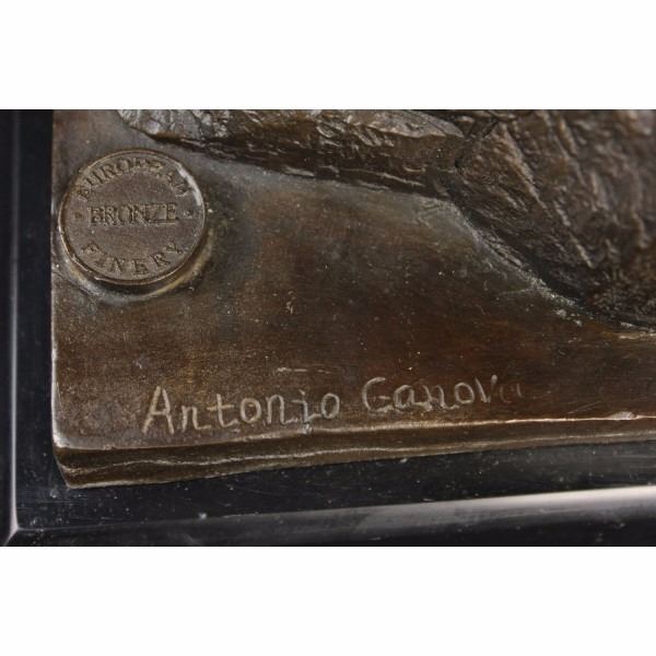 This is a bronze replication of antonio canova's statue psyche revived by cupid's kiss, first commissioned in 1787. It exemplifies the neoclassical devotion to love and emotion. It represents the god cupid in the height of love and tenderness, immediately after awakening the lifeless psyche with a kiss, a scene excerpted from lucius apuleius' the golden ass. A masterpiece of its period, it appeals to the senses of sight and touch, yet simultaneously alludes to the romantic interest in emotion co-existing with neoclassicism. The handmade bronze sculpture was cast using the ancient method of lost-wax casting and stained with a brown patina finish for perpetuation. it is mounted upon a black variegated marble base.