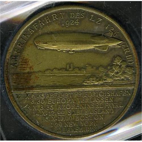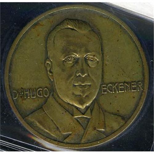 <B>Zeppelin ZR3 Flight Medal, 1924.</B></I> Bronze, 1.3125 in., 33.4 mm . Obv. bust of Hugo Eckener, president of Zeppelin Co., pilot of ZR3. Rev. Zeppelin in flight from Germany to Lakehurst, N.J. Struck by L. Chr. Lauer, Nurnberg.<BR><BR><b>Shipping:</b> Coins & Currency (<a target="_blank" href="http://www.heritageauctions.com/common/shipping.php">view shipping information</a>)