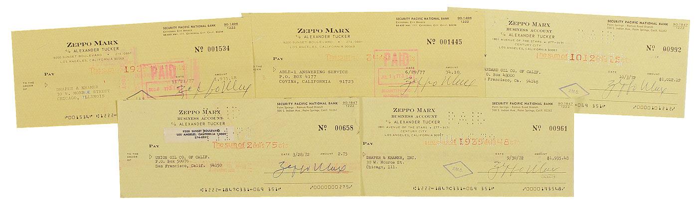 Five business checks, 8.5 x 3.5, three dating to 1972 and two dating to 1977, each filled out in type and each signed by Zeppo Marx. In overall fine condition, with staple holes, and expected bank cancellation holes and stamps touching his name.