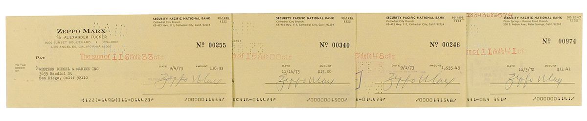 Four personal checks, 8.5 x 3.5, each filled out in type and signed by Marx, dating from 1972–73. In fine condition, with cancellation holes and bank stamps to each check, some lightly showing through under signatures.