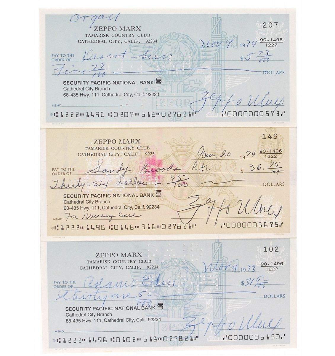 Three personal checks from 1973–1974, 6 x 2.75, each filled out and signed in blue or black ballpoint, “Zeppo Marx.” In fine condition, with light handling wear and expected bank cancellation holes and stamps.