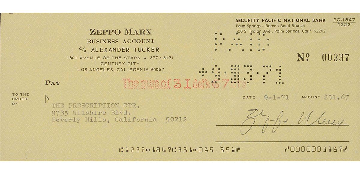 Personal business account check, 8.5 x 3.5, filled out in type and signed by Marx, “Zeppo Marx,” payable to The Prescription Ctr for $31.67, September 1, 1971. Nicely double-matted and framed with a photo of the Marx Brothers’ Cocoanuts poster to an overall size of 20 x 23.5. In fine condition, with expected bank stamps.