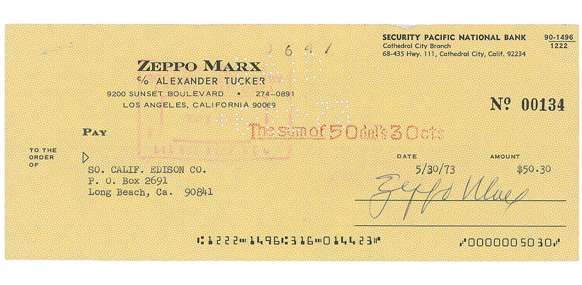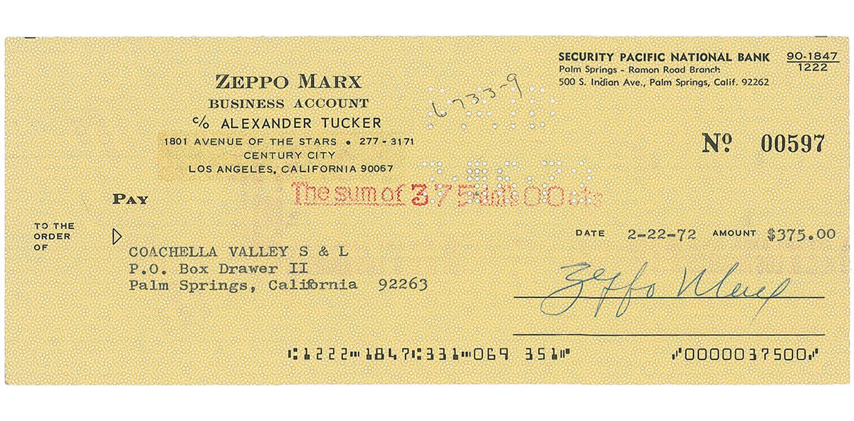 Two personal checks, each 8.5 x 3.5, filled out in type and signed by Marx, dated 1972 and 1973. In overall fine condition, with expected bank stamps and cancellation holes.