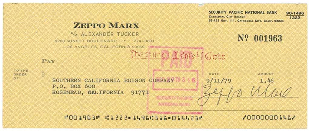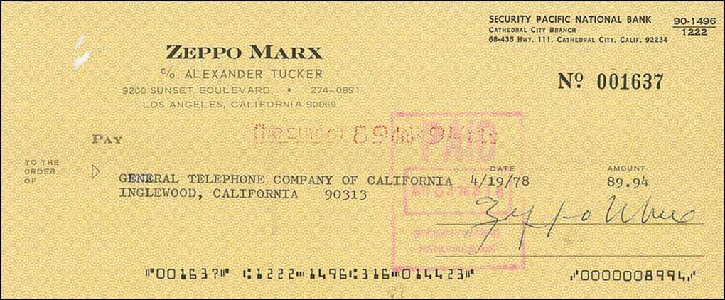 Two personal checks, 8.5 x 3.5, both filled out in type and signed by Marx, dated 1978 and 1979 respectively. Bank stamp over first name of both signatures, and a staple hole to each top left corner, otherwise fine condition.