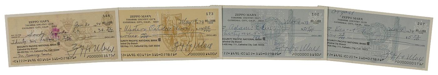 Four personal checks from 1973–1974, 6 x 2.75, each filled out and signed in blue or black ballpoint, “Zeppo Marx.” In fine condition, with light handling wear and expected bank cancellation holes and stamps.