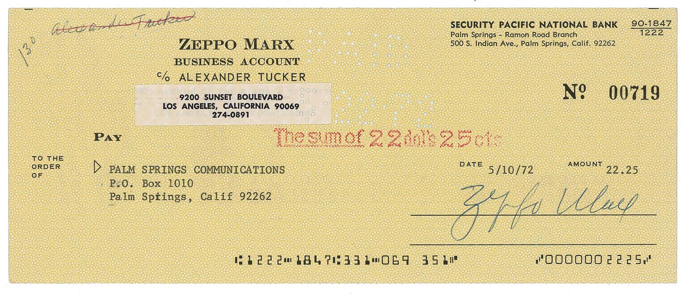 Business check, 8.5 x 3.5, filled out in type and signed by Marx, payable to Palm Springs Communications for $22.25, May 10, 1972. In fine condition, with expected cancellation holes, a couple small notations, and an address label affixed near top.