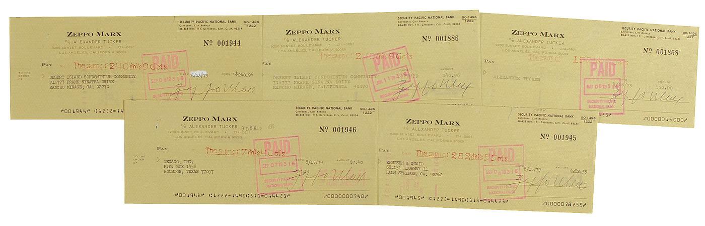 Five business checks, 8.5 x 3.5, all dating to 1979, each filled out in type and each signed by Zeppo Marx. In overall fine condition, with expected bank cancellation holes and stamps touching his name.