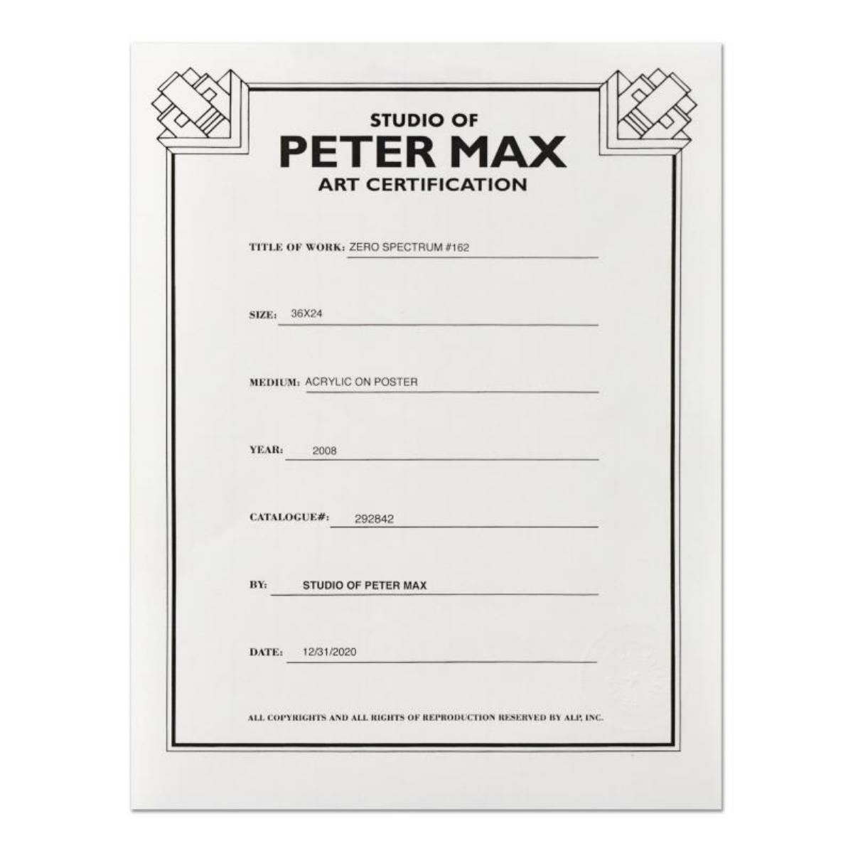 "Zero Spectrum" is a one-of-a-kind acrylic mixed media on paper, hand signed by Peter Max. This piece comes custom framed. Includes Certificate of Authenticity from Peter Max Studios. Measures approx. 34.5" x 46.5" (with frame), 23" x 35" (image).