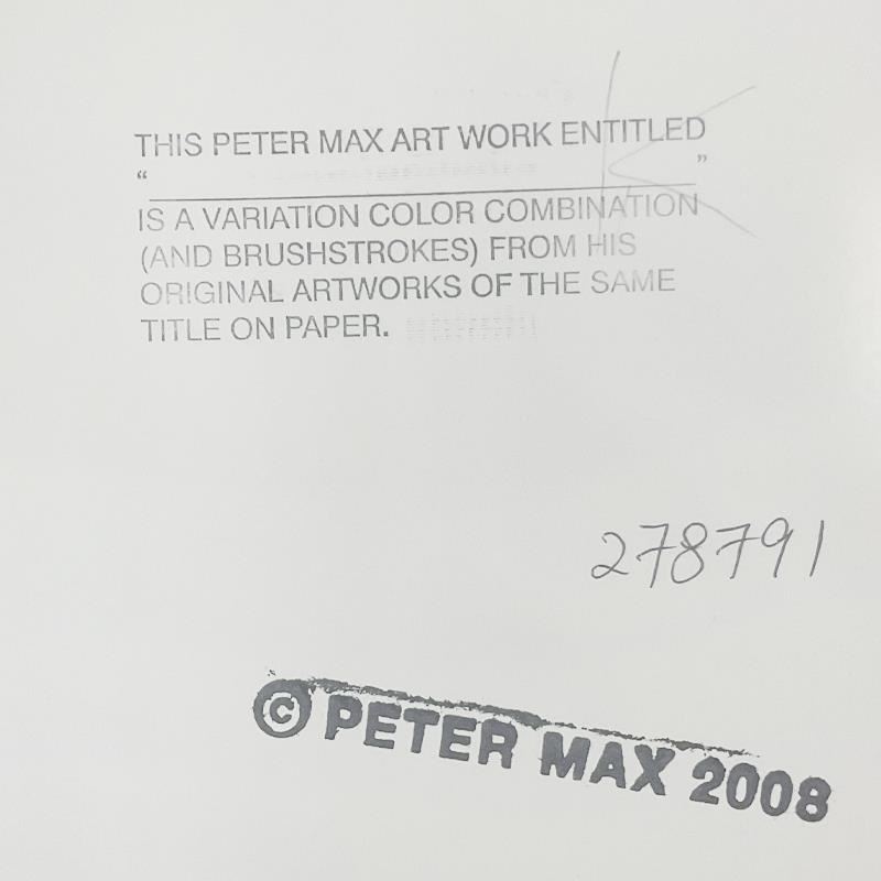 "Zero Spectrum" is a one-of-a-kind acrylic mixed media on paper, hand signed by Peter Max. The piece comes custom framed with a backside cutout to display Peter Max Studio registration number 278791 certifying authenticity. Measures approx. 42" x 30" (frame), 36" x 24" (image).