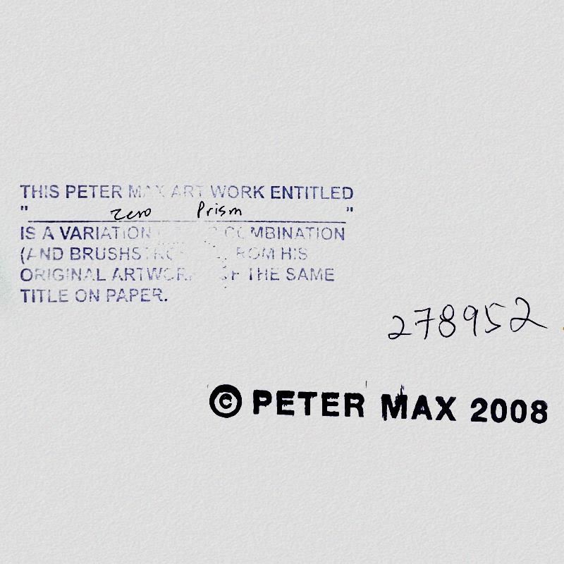 "Zero Spectrum" is a one-of-a-kind mixed media on paper, hand signed by Peter Max. The piece comes custom framed with a backside cutout to display Peter Max Studio registration number 278952 certifying authenticity. Measures approximately 48" x 36" (frame), 36" x 24" (image). This item requires special handling and may have a longer than usual turnaround.
