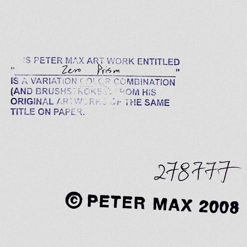"Zero Spectrum" is a one-of-a-kind mixed media on paper, hand signed by Peter Max. The piece comes custom framed with a backside cutout to display Peter Max Studio registration number 278777 certifying authenticity. Measures approximately 48" x 36" (frame), 36" x 24" (image). This item requires special handling and may have a longer than usual turnaround.