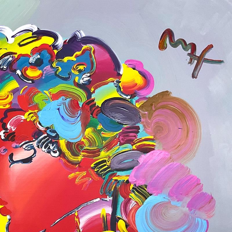 "Zero in Love" is a one-of-a-kind acrylic mixed media on paper, hand signed by Peter Max. On the reverse side of this piece there is a registration number from Peter Max Studios certifying authenticity. This piece comes custom framed. Measures approx. 30" x 42" (frame), 24" x 36" (image).