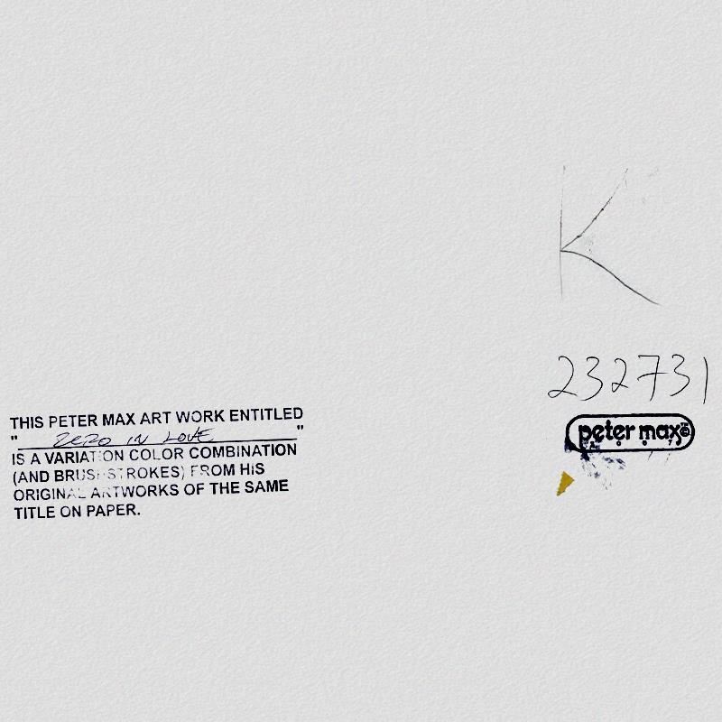 "Zero in Love" is a one-of-a-kind mixed media on paper, hand signed by Peter Max. The piece comes custom framed with a backside cutout to display Peter Max Studio registration number 232731 certifying authenticity. Measures approximately 36" x 48" (frame), 24" x 36" (image).