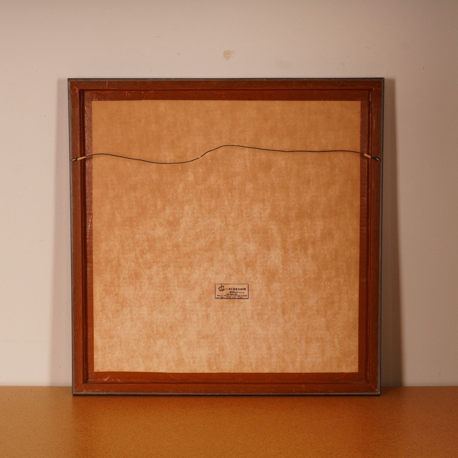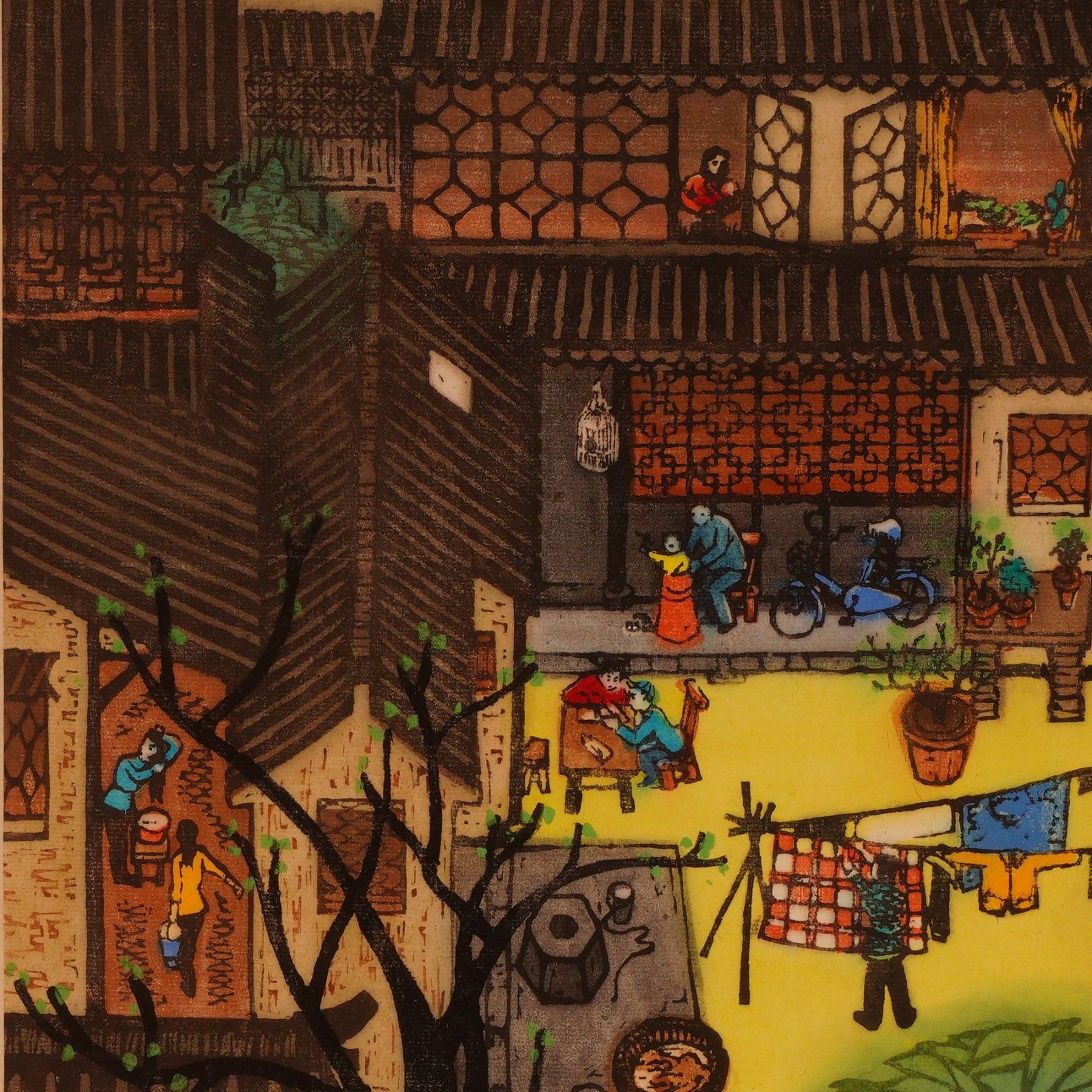 Color woodcut on paper by Chinese artist Zhai Zhimin titled Small Yard, depicting a lively courtyard scene with villagers engaging in daily activities amid traditional architecture. This vibrant composition captures the warmth and rhythm of community life through finely detailed linework and vivid color. The print bears the artist's red seal and is pencil signed and numbered III 14/60, dated 1986. Presented in a matted black frame. A striking and richly textured example of contemporary Chinese woodblock art.
