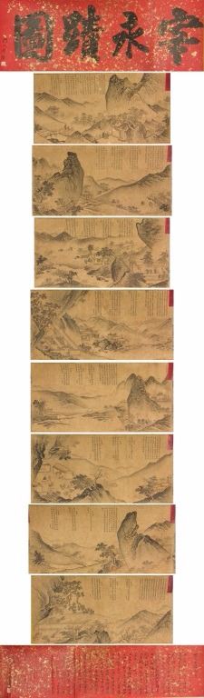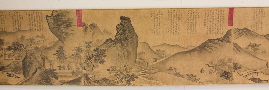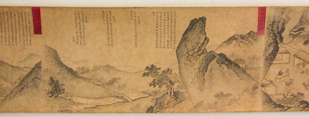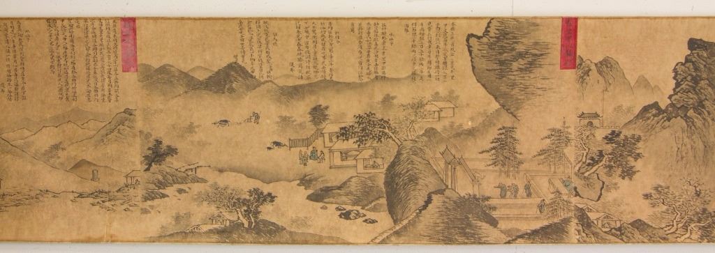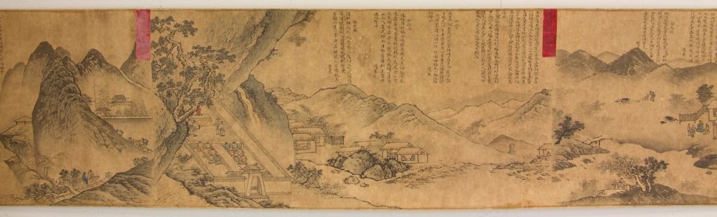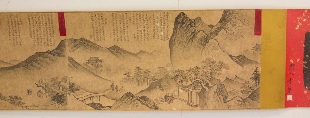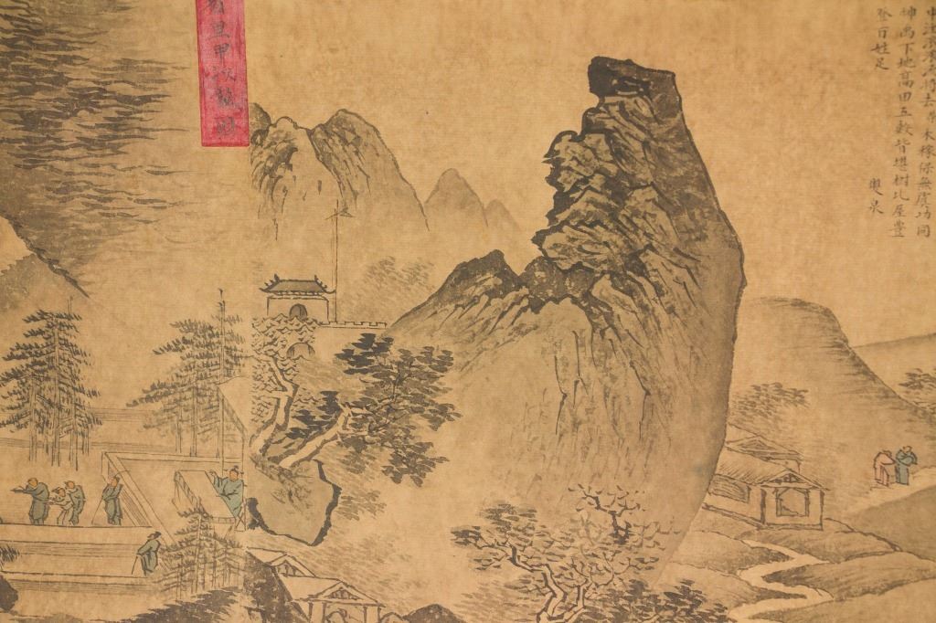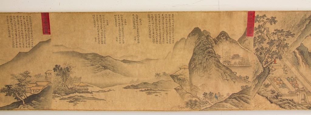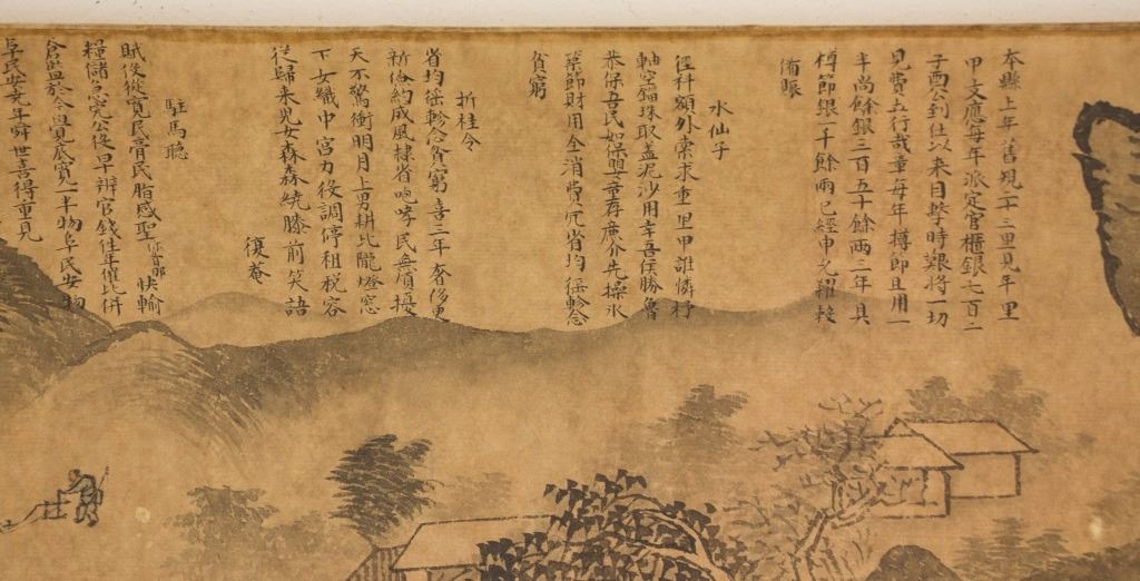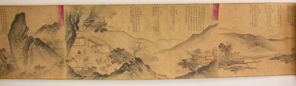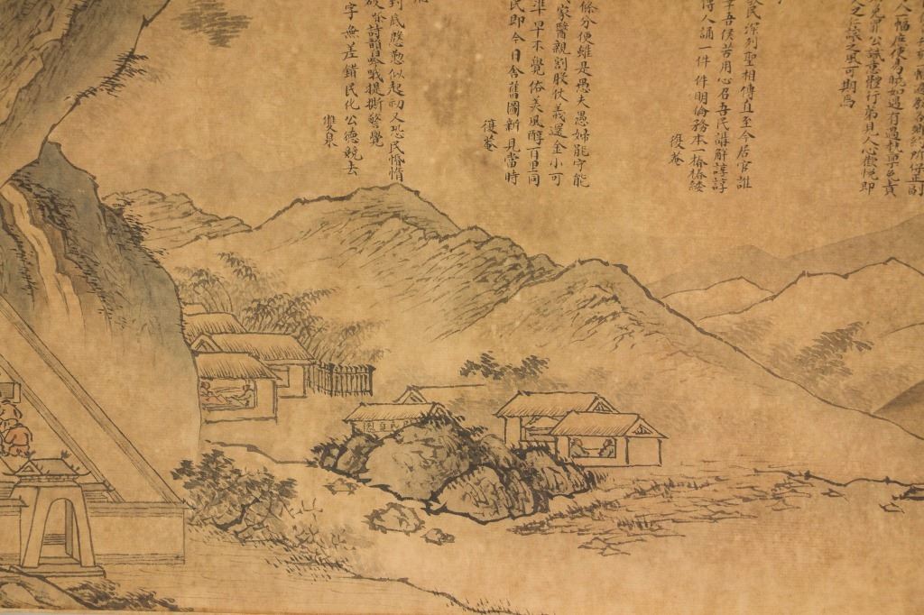"Zai Yong Ji Tu", Zhan Jifeng (1532-1602) painted for Zuo Siming when he was the county magistrate of Yongcheng; depicting Zuo Siming's political achievements; Chinese ink and watercolour on paper; long hand scroll; title written by Li Zhi, Zuo's disciple, inscribed with 1 seal; afterword written by Li Nan, Zuo's disciple, inscribed with 1 seal; of 29 cm x 445 cm