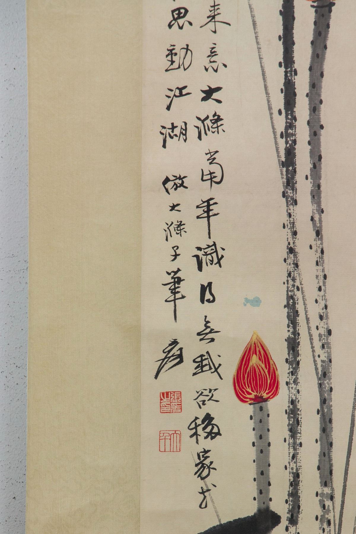 Painting of lotus flower; Chinese ink and watercolour on four pieces of paper; hanging scroll; signed Zhang Daqian (1899-1983); inscribed with 3 artist seal; 95.5cm x 44cm each