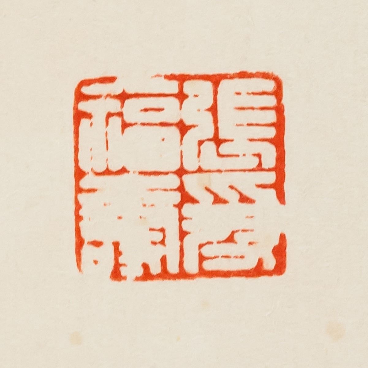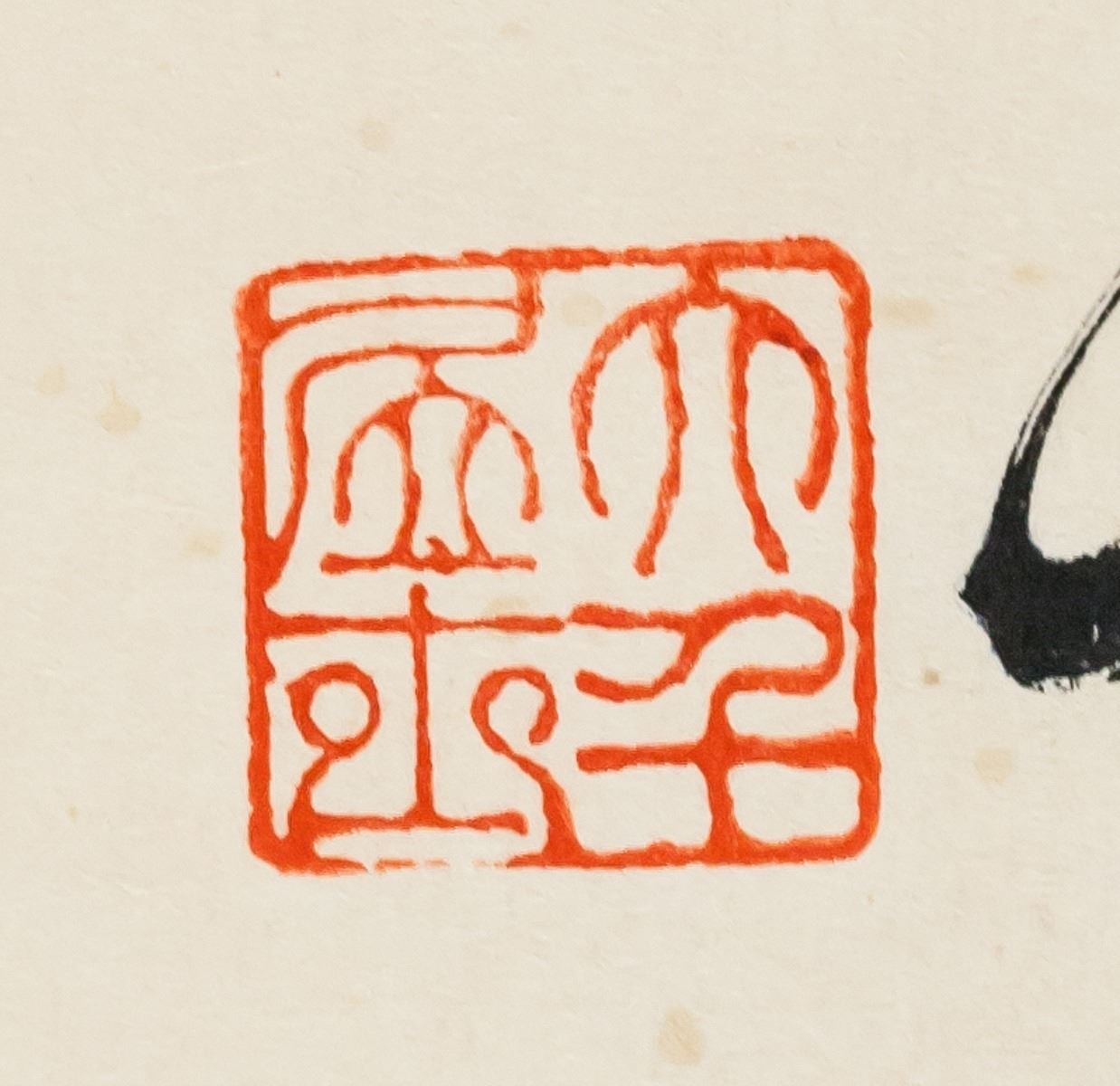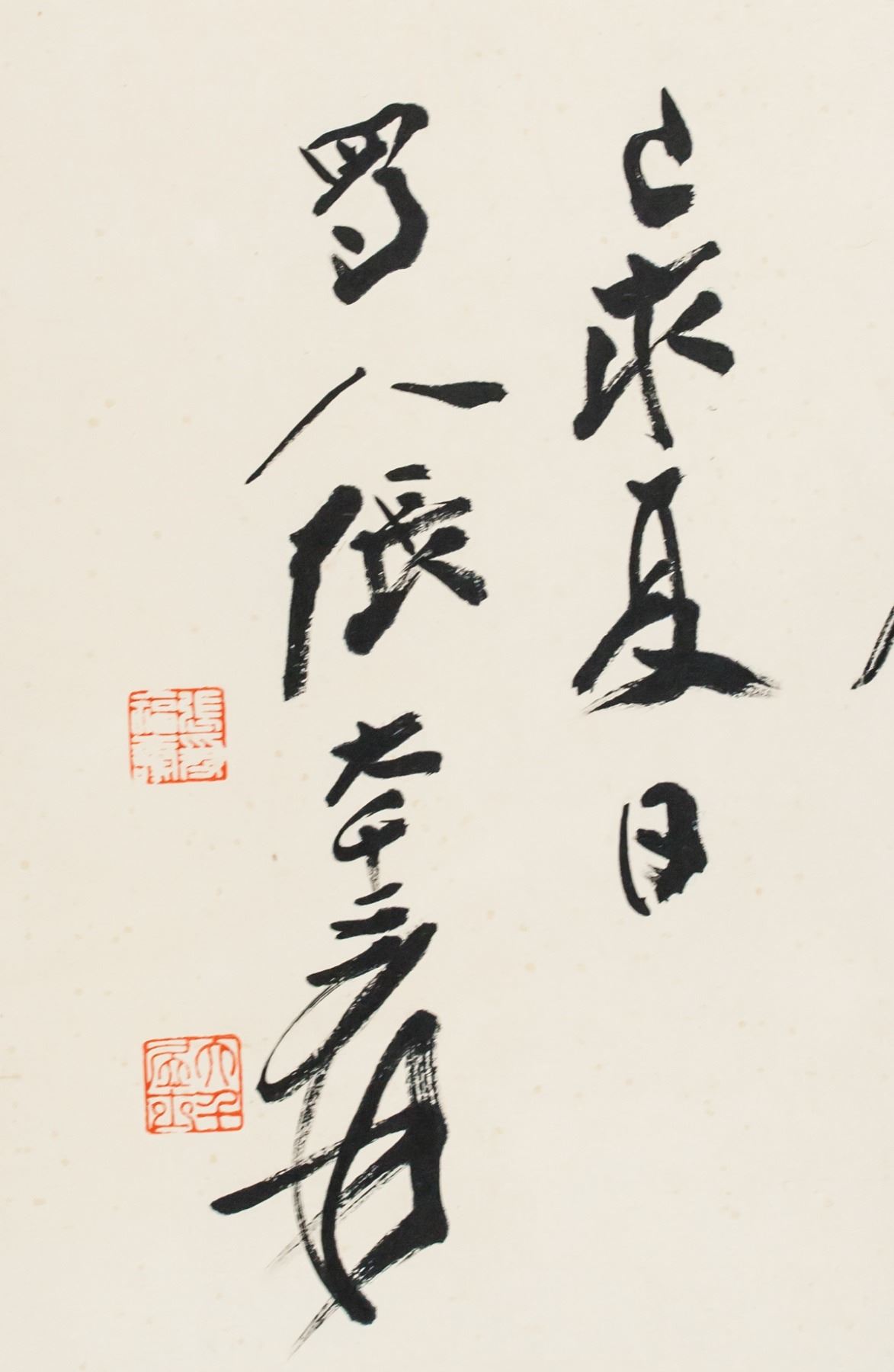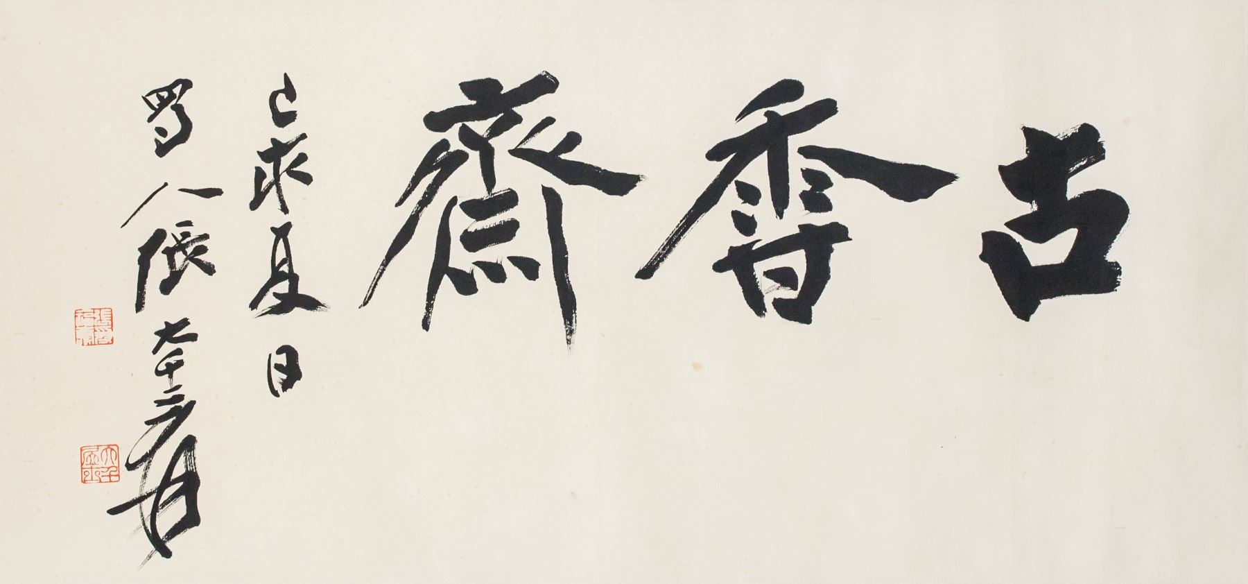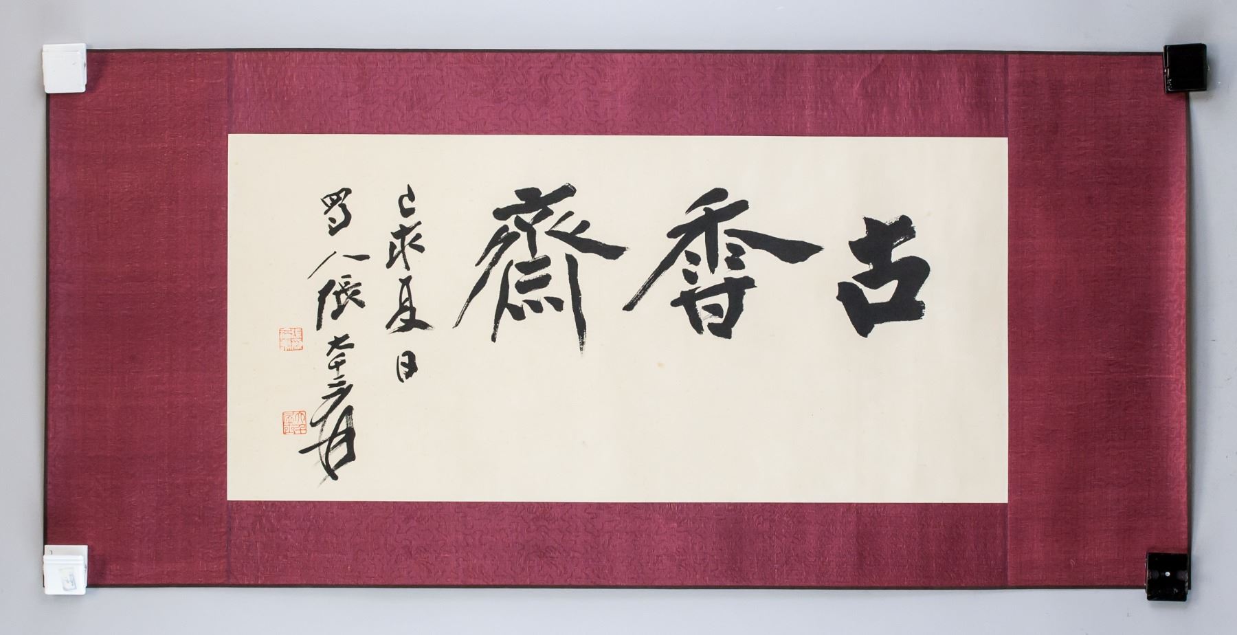 Ink on paper roll. Featuring Chinese calligraphy Gu Xiang Zhai. Signed Zhang Daqian (1899-1983, Chinese), inscribed with 2 artist seals. 32 x 68 cm