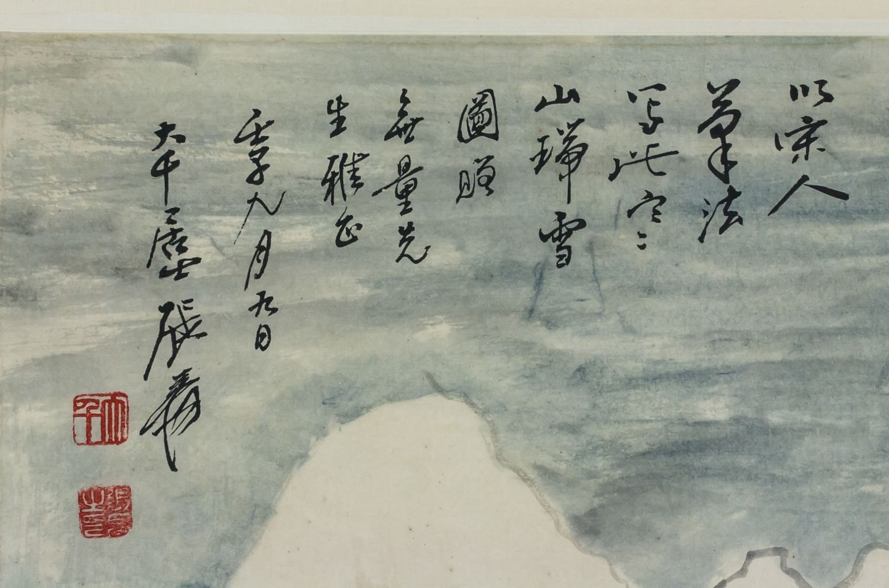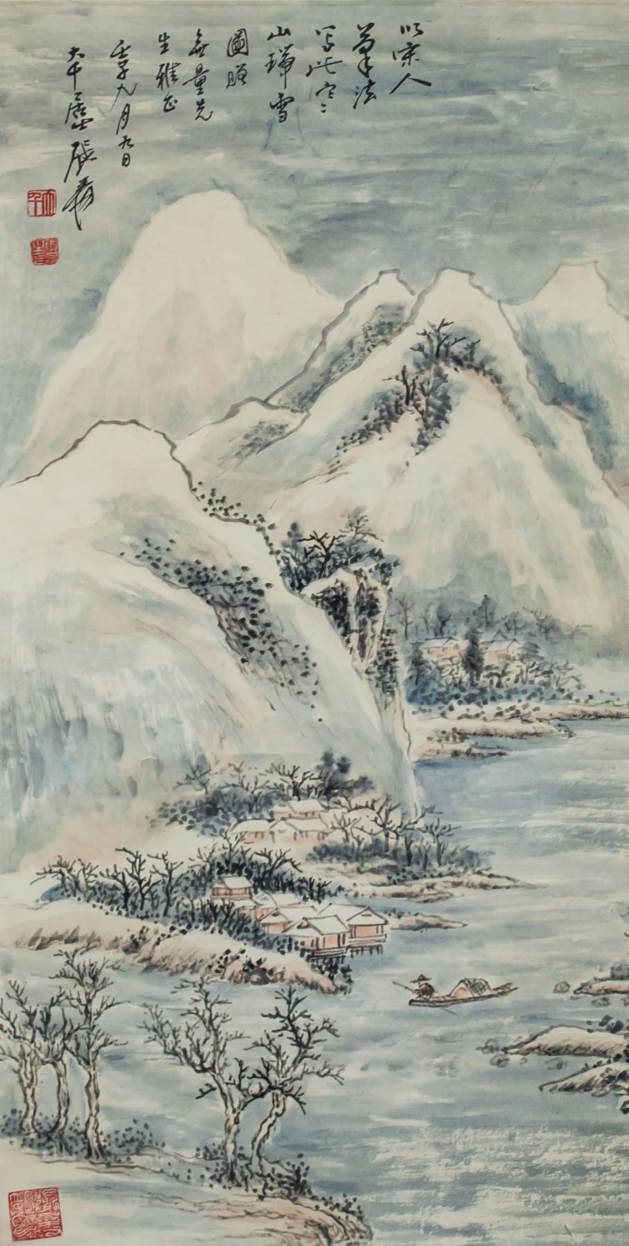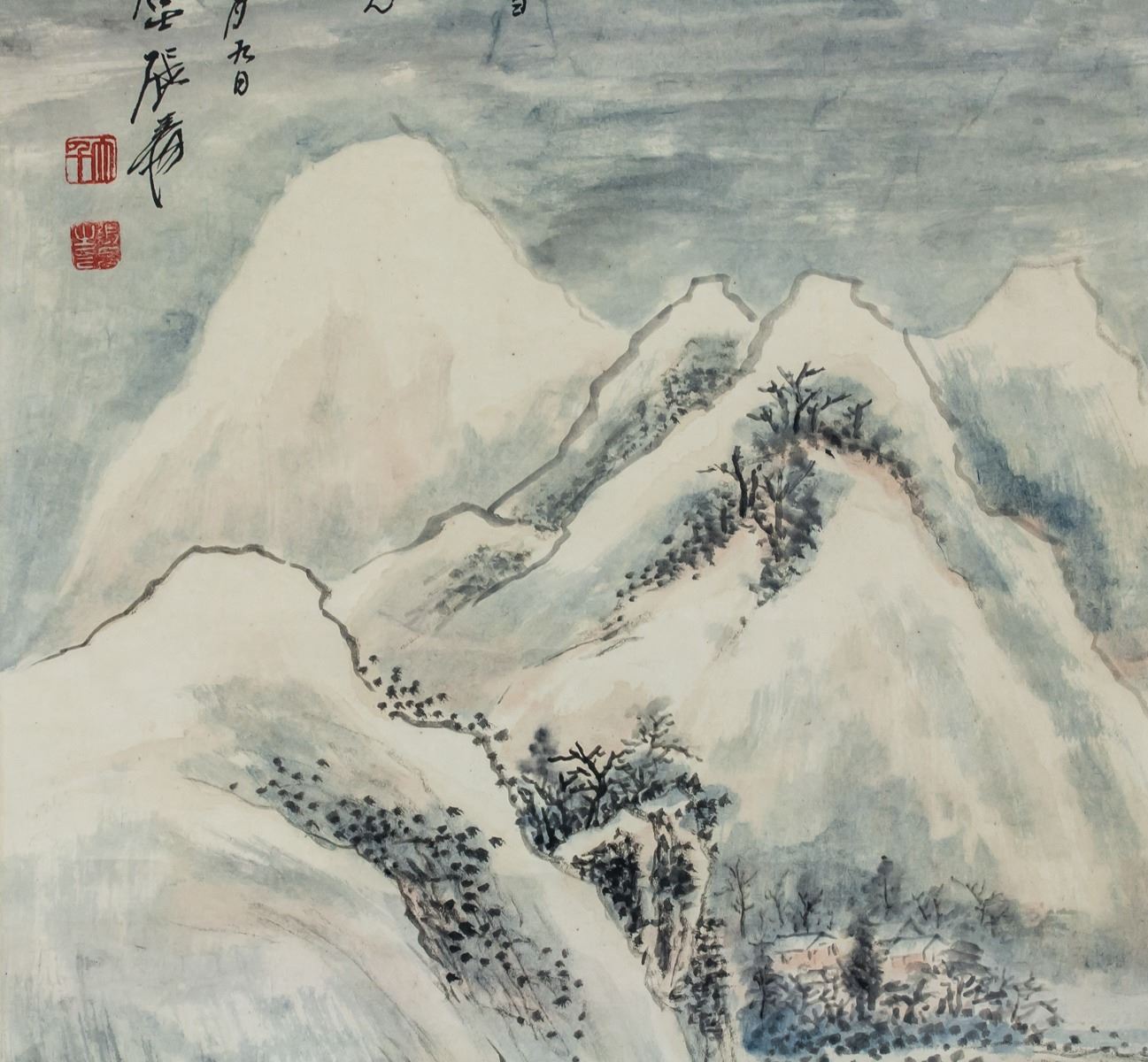 Ink and watercolor on paper, hanging scroll. Featuring mountainous landscape. Signed Zhang Daqian (1899-1983, Chinese), inscribed with 3 artist seals. 65.5 x 34 cm