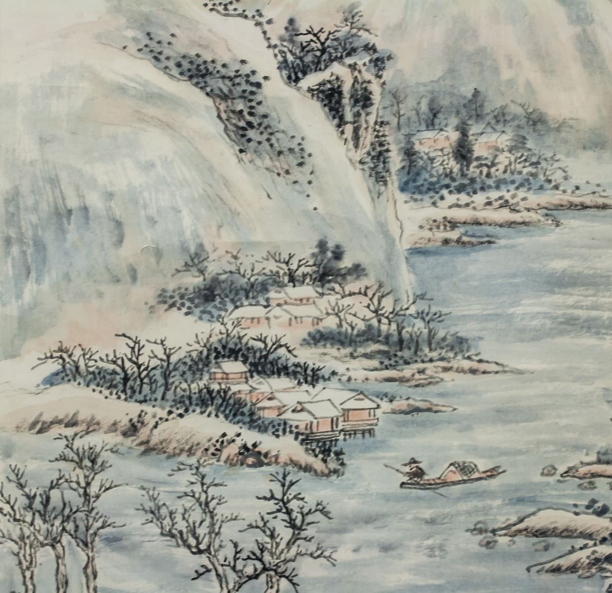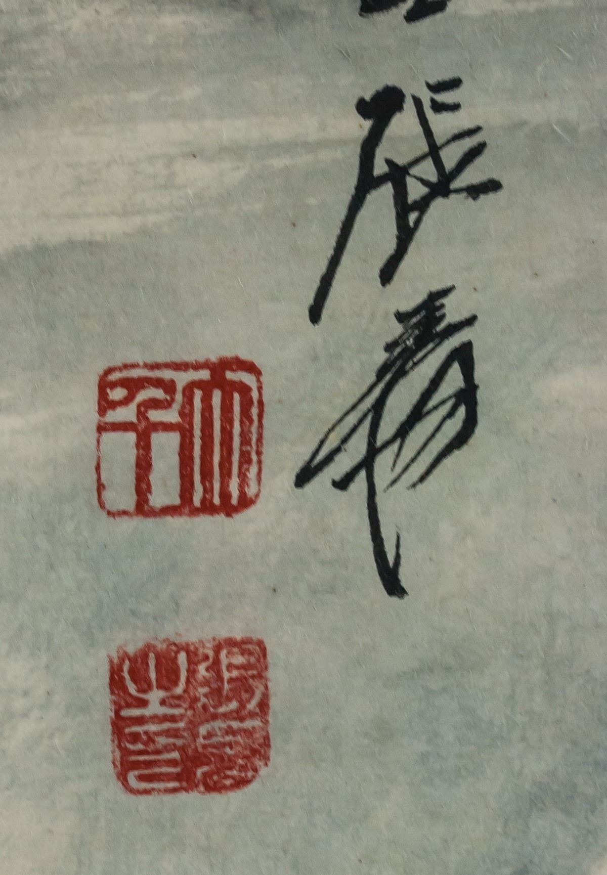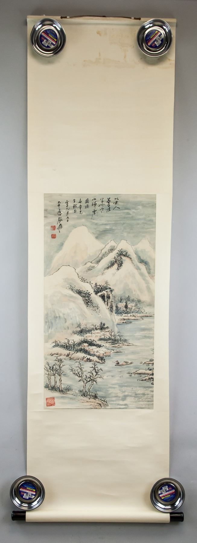 Ink and watercolor on paper, hanging scroll. Featuring mountainous landscape. Signed Zhang Daqian (1899-1983, Chinese), inscribed with 3 artist seals. 65.5 x 34 cm