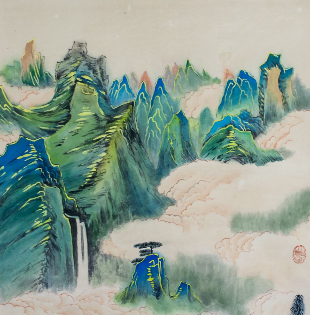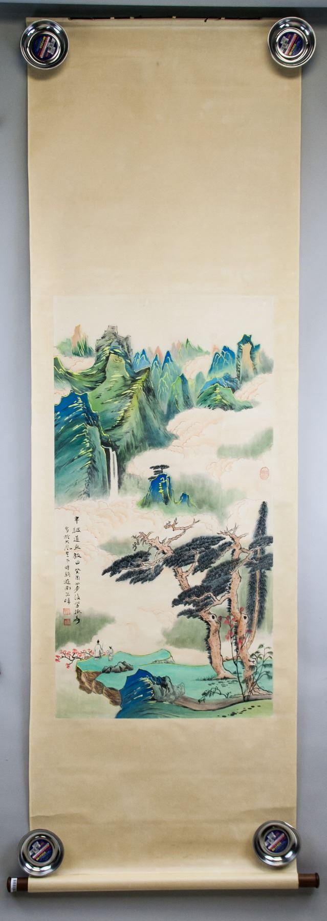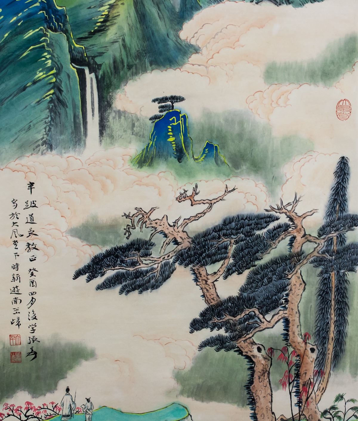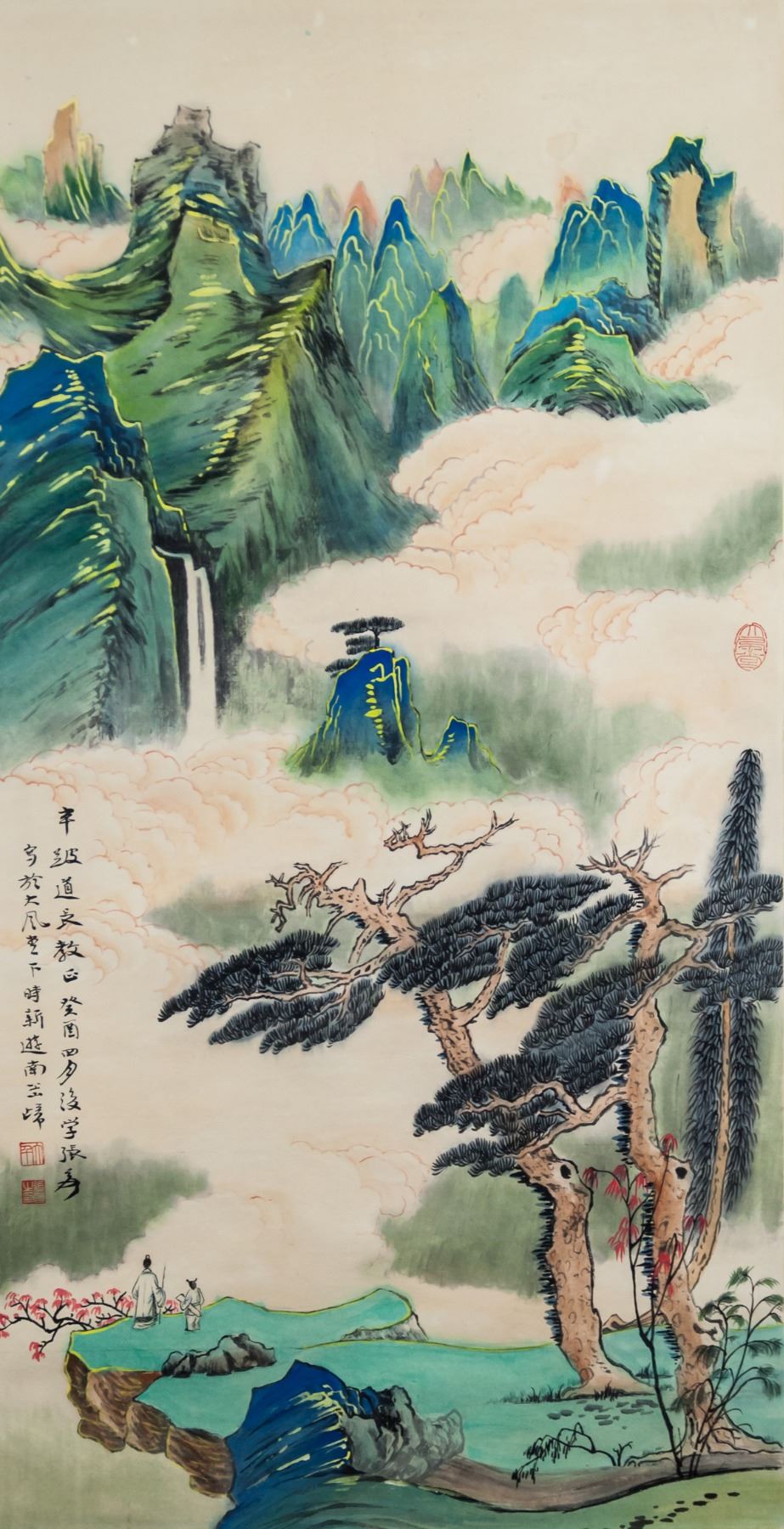 Ink and watercolor on paper, hanging scroll. Featuring mountainous landscape. Signed Zhang Daqian (1899-1983, Chinese), inscribed with 3 artist seals. 95 x 48 cm