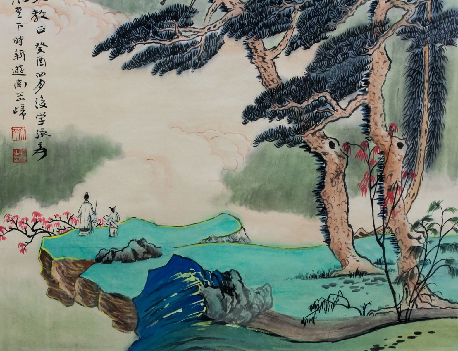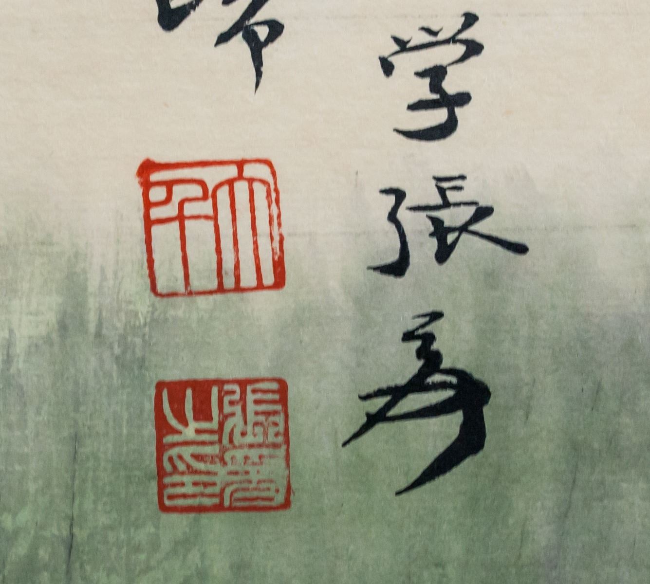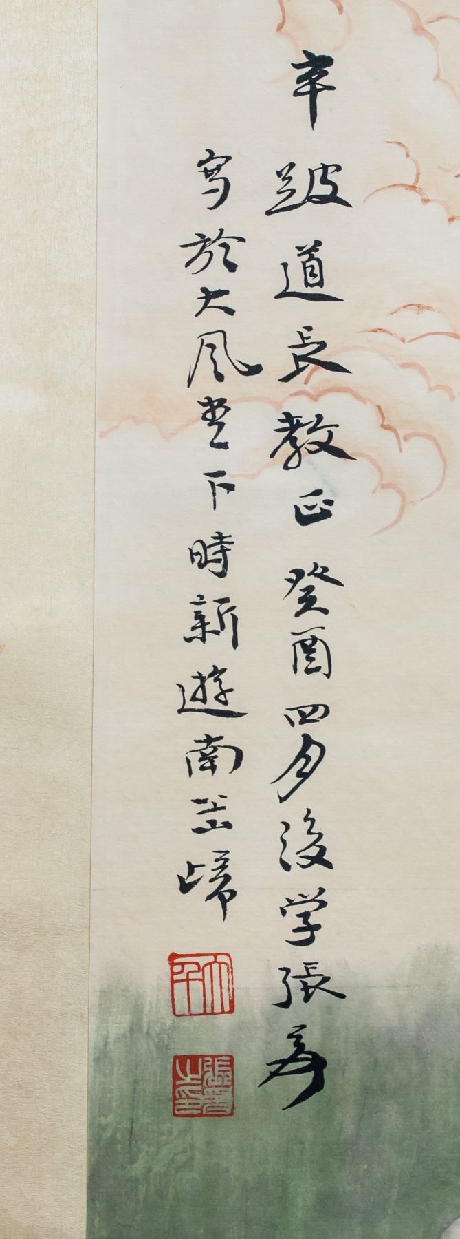 Ink and watercolor on paper, hanging scroll. Featuring mountainous landscape. Signed Zhang Daqian (1899-1983, Chinese), inscribed with 3 artist seals. 95 x 48 cm