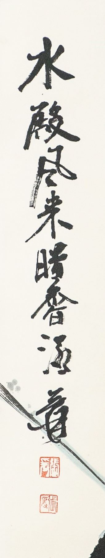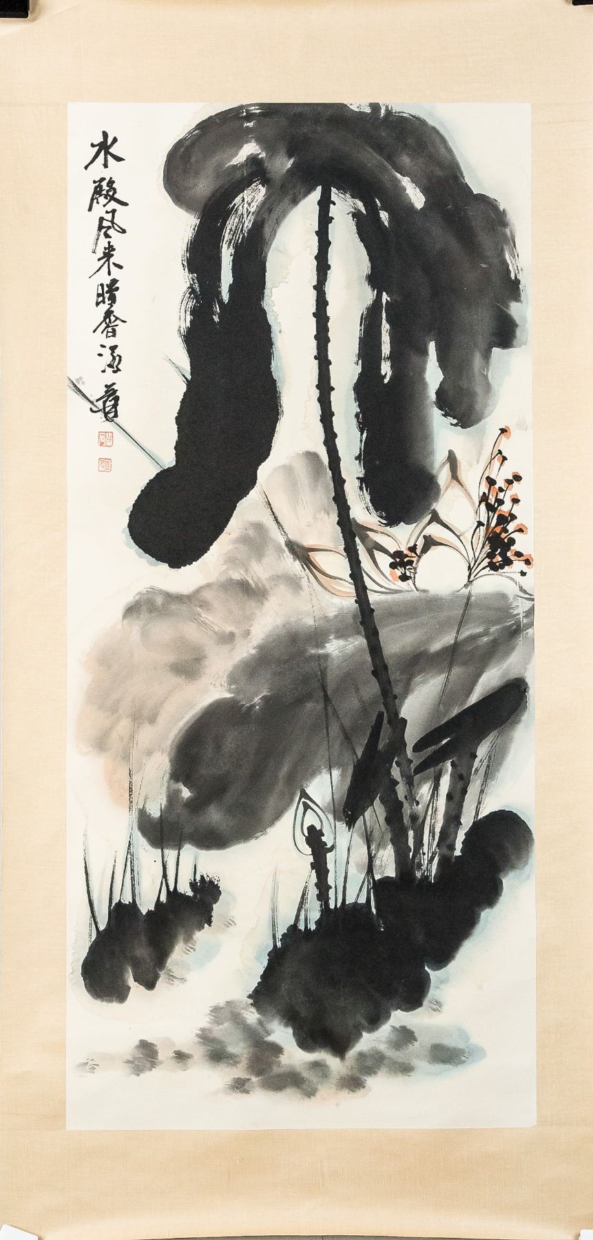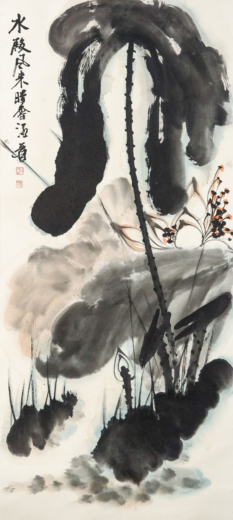Ink and watercolour on paper, featuring a painting of lotus, signed and attributed to Zhang Daqian (Chinese, 1899-1983), 95 x 43 cm. Zhang Daqian was a Chinese artist known for painting in traditional Eastern techniques while exploring the Western movements of Impressionism and Expressionism. His use of delicate brushstrokes and splashed color application, produced unique images of nature? He was also known for his forgeries of ancient Chinese masters, such as Shi Tao, Tang Yin, and Chen Hongshou. Today, Zhang’s home, known as the Zhang Daqian Residence, is a memorial to the artist maintained by the National Palace Museum in Taipei, his works are held in the collections of the Metropolitan Museum of Art in New York, the Art Institute of Chicago, the Denver Art Museum, and the Los Angeles County Museum of Art, among others.