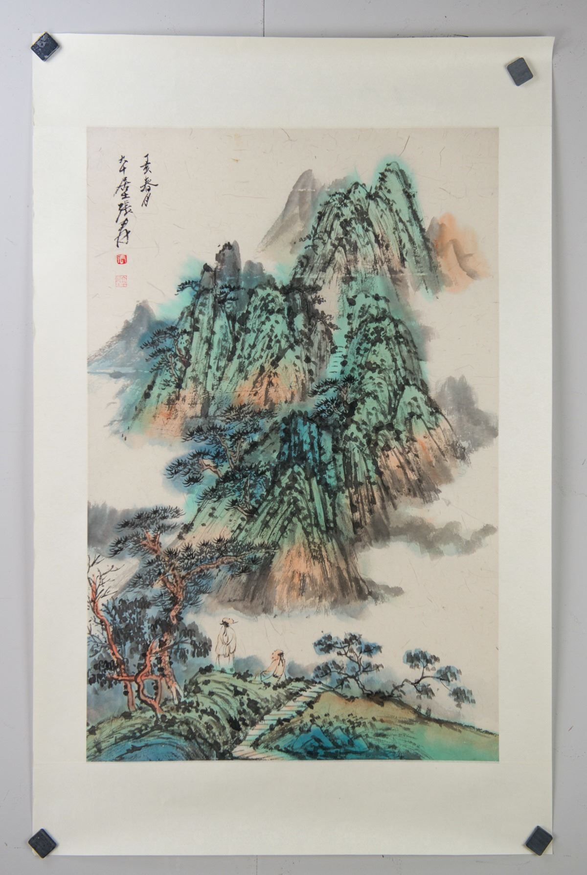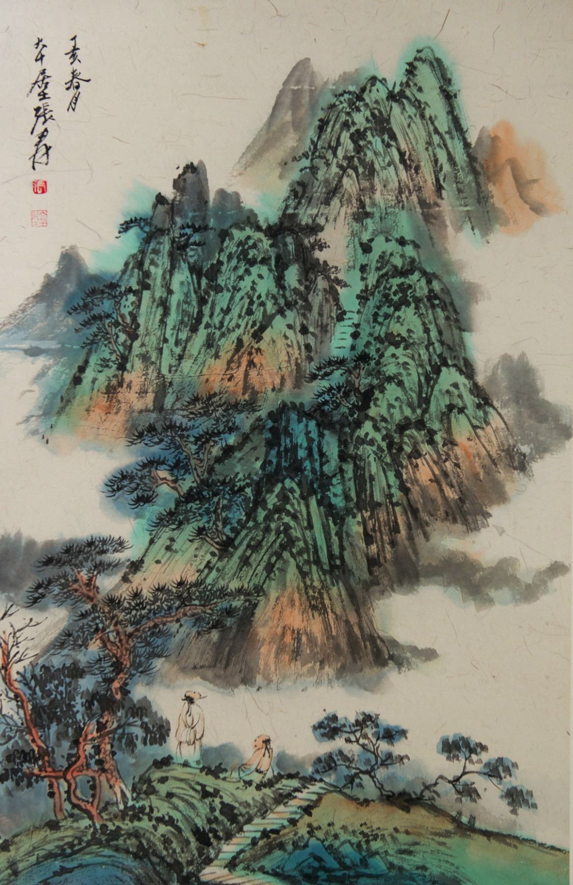 Ink and watercolor on paper roll. Featuring mountainous landscape. Signed Zhang Daqian 1899-1983 Chinese, inscribed with 2 artist seals. 69 x 44 cm. Provenance: T. Ng Collection Toronto.