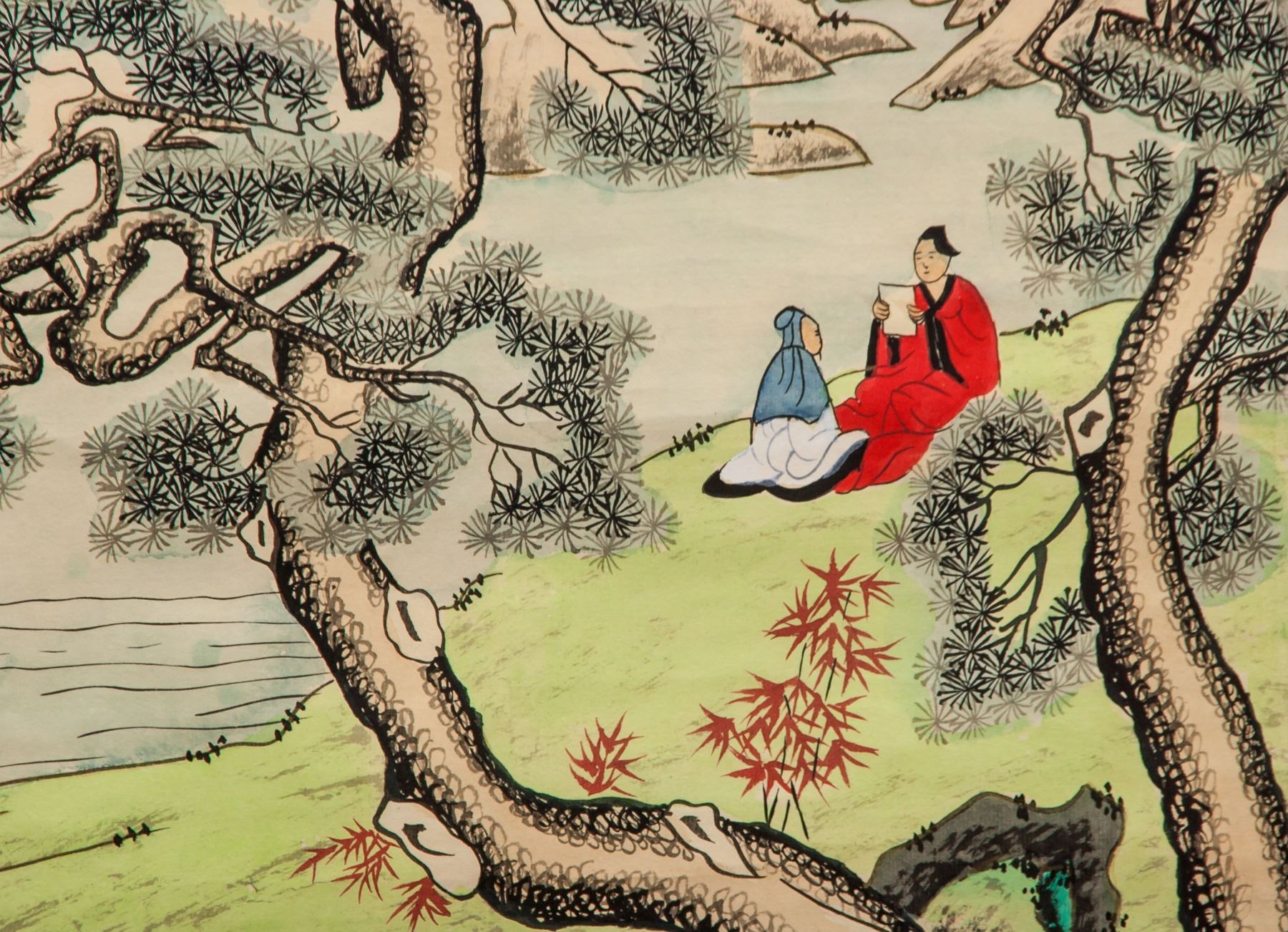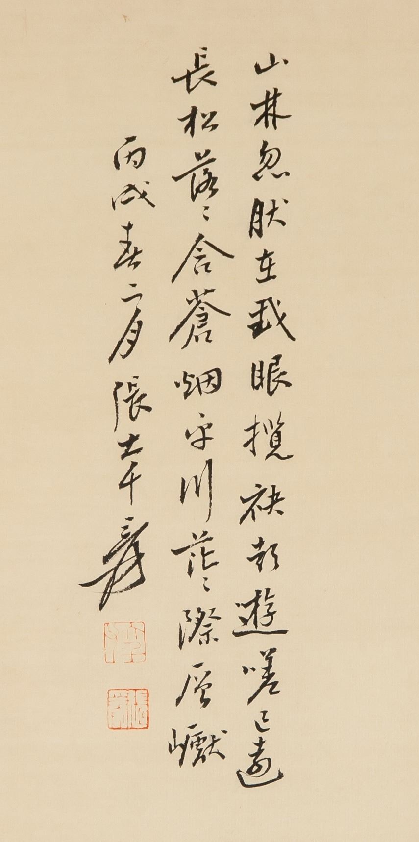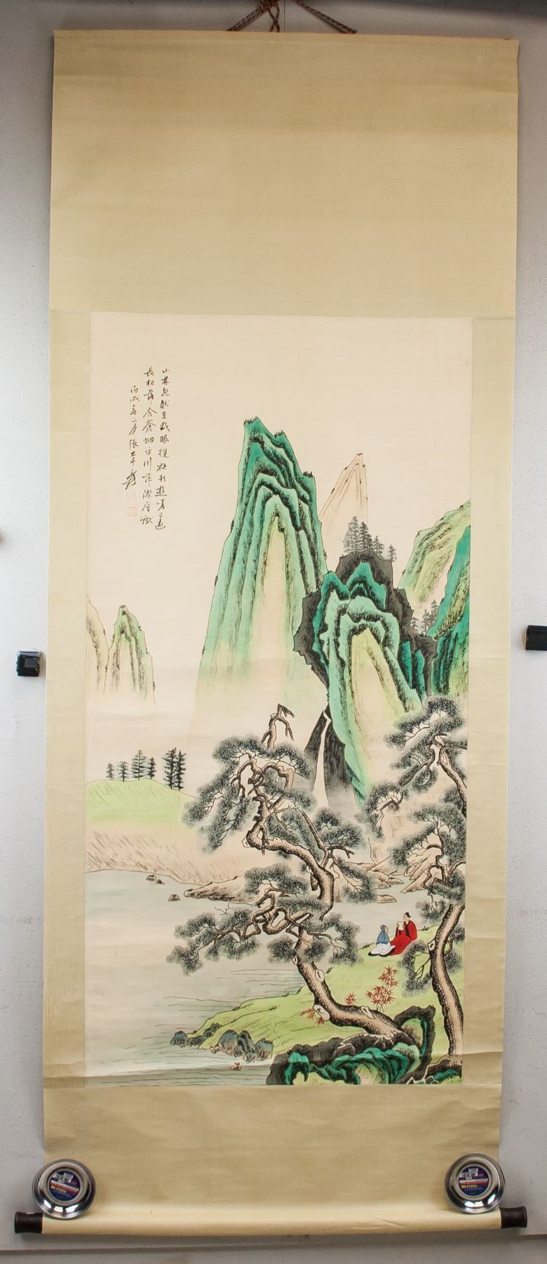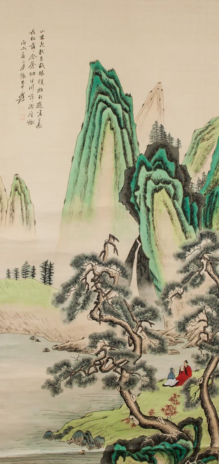 Watercolor and ink on paper, hanging scroll. Featuring mountainous landscape and hermits. Signed and attr. Zhang Daqian 1899-1983 Chinese, inscribed with 2 artist seals. 129 x 63 cm. Zhang Daqian was a Chinese artist known for painting in traditional Eastern techniques while exploring the Western movements of Impressionism and Expressionism. His use of delicate brushstrokes and splashed color application, produced unique images of nature, as seen in his work Lotus (1963). He was also known for his forgeries of ancient Chinese masters, such as Shi Tao, Tang Yin, and Chen Hongshou. Born Zhang Yuan on May 10, 1899 in Neijiang, China, Zhang learned to paint flowers from his mother at a young age, going on to study traditional Chinese painting methods in Shanghai under Zeng Xi and Li Ruiqing. Over the course of his life Zhang travelled the world, even meeting Pablo Picasso during a 1956 visit to Nice, France. The artist died on April 2, 1983 in Taipei, Taiwan at the age of 84. Today, Zhang’s home, known as the Zhang Daqian Residence, is a memorial to the artist maintained by the National Palace Museum in Taipei, his works are held in the collections of the Metropolitan Museum of Art in New York, the Art Institute of Chicago, the Denver Art Museum, and the Los Angeles County Museum of Art, among others.