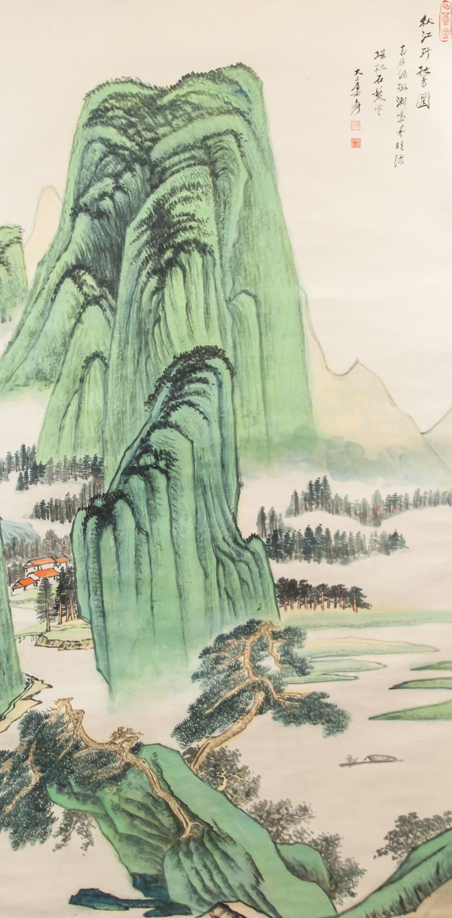 Chinese ink and watercolor on paper. Featuring verdant green mountains and pine trees. Signed "Daqian" in Chinese characters to the top right. Inscribed with three seals. Attributed to Zhang Daqian (1899-1983, Chinese). 139 x 58 cm.