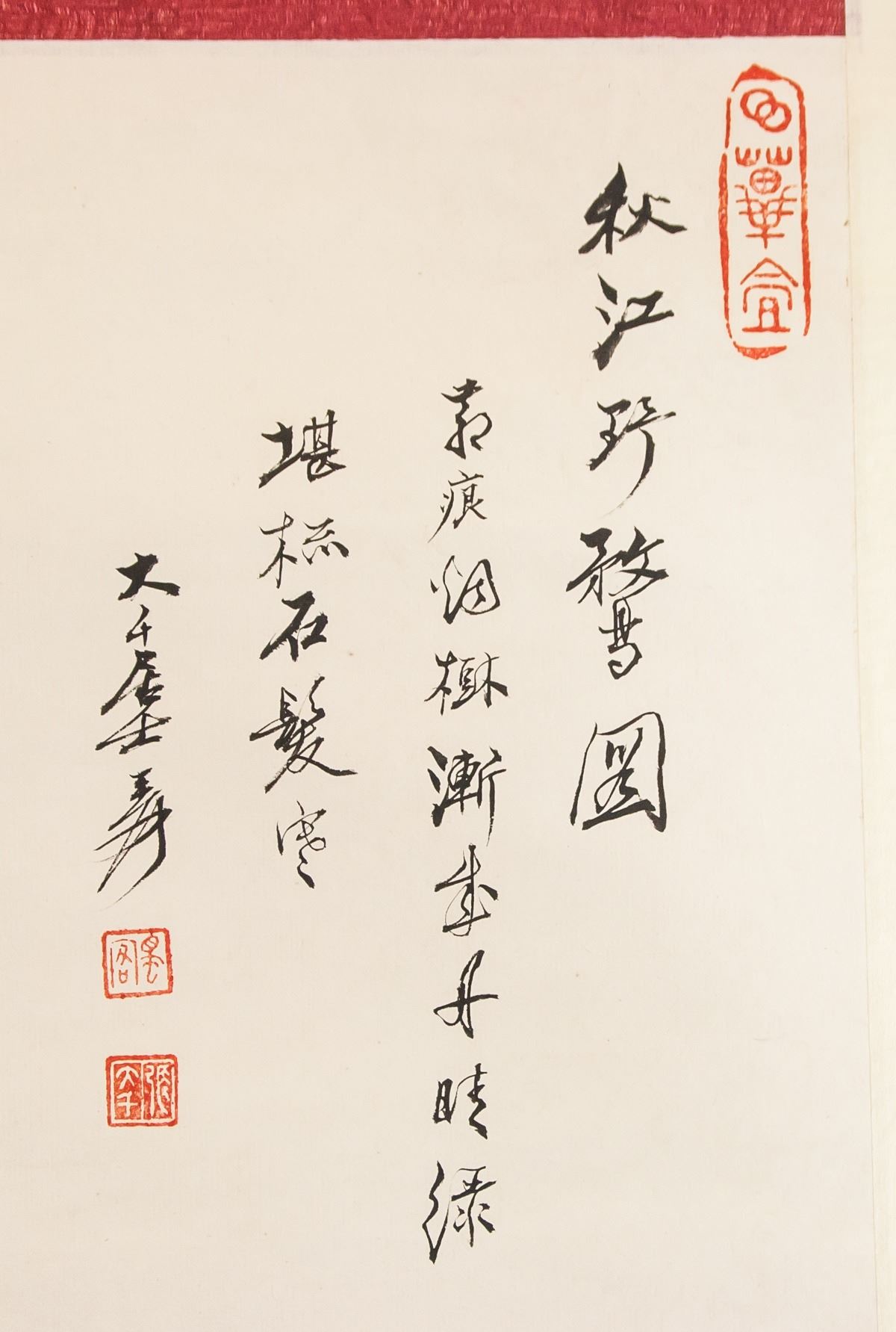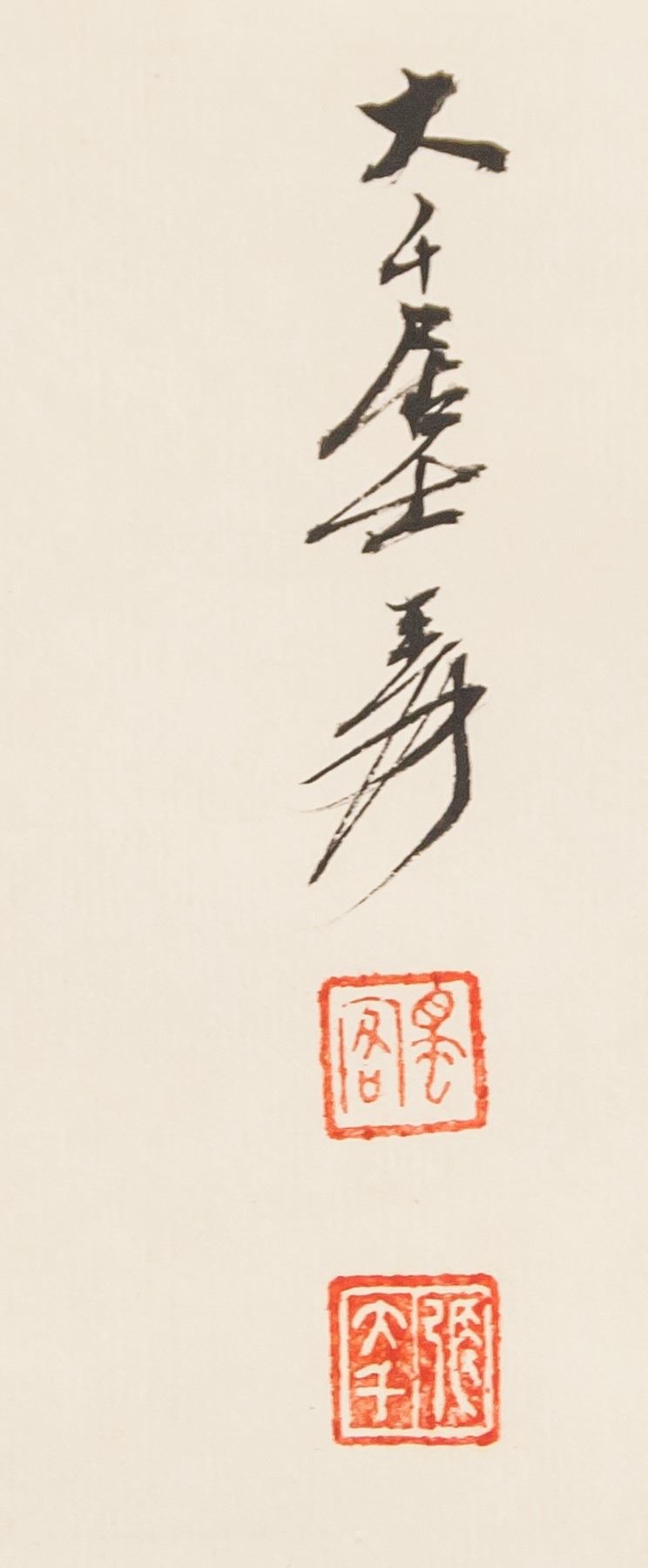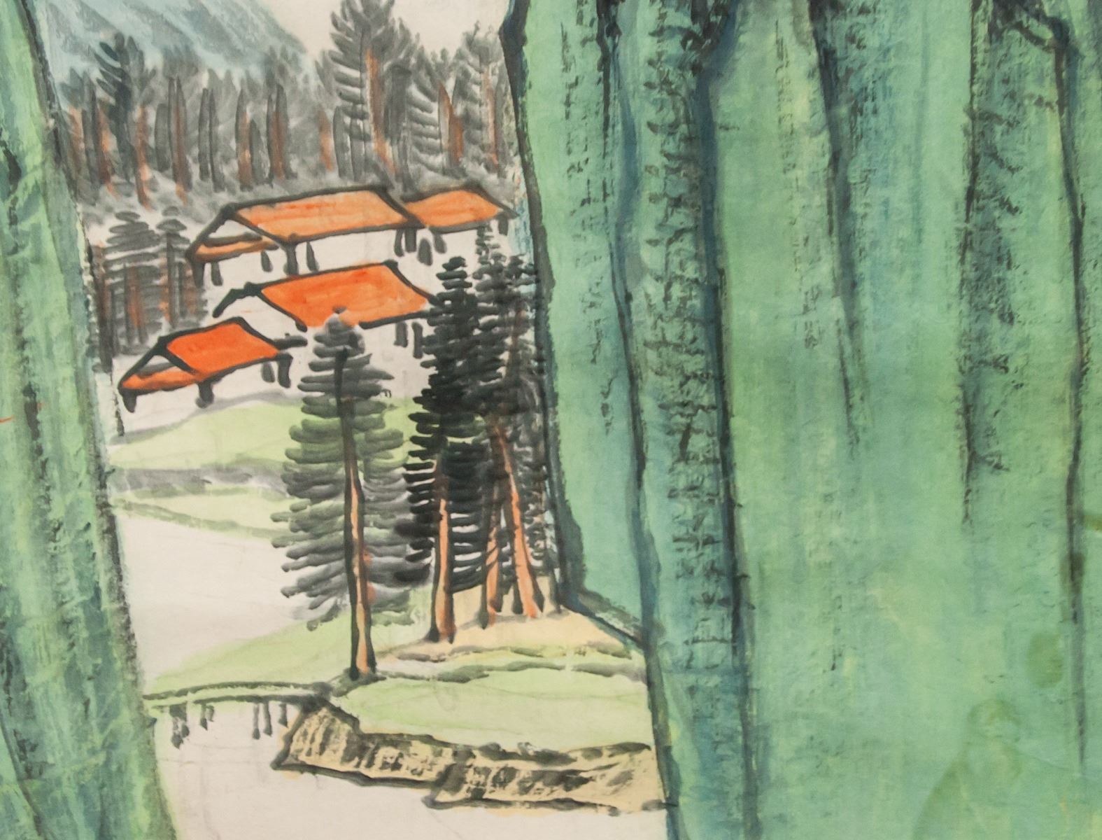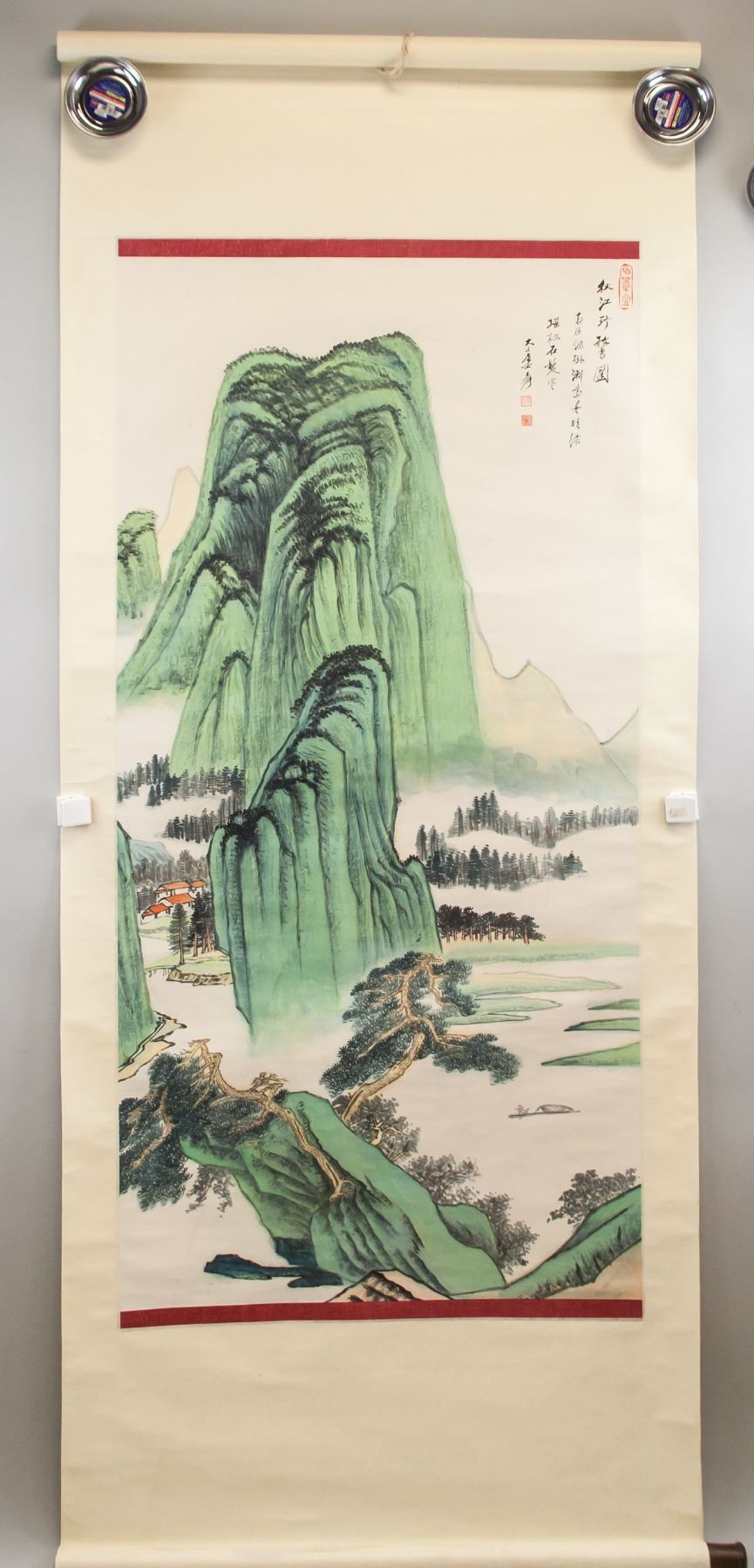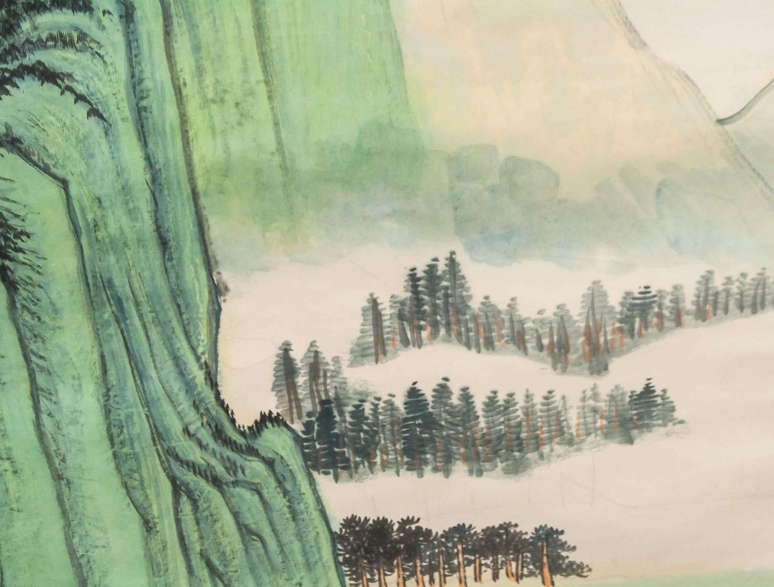 Chinese ink and watercolor on paper. Featuring verdant green mountains and pine trees. Signed "Daqian" in Chinese characters to the top right. Inscribed with three seals. Attributed to Zhang Daqian (1899-1983, Chinese). 139 x 58 cm.