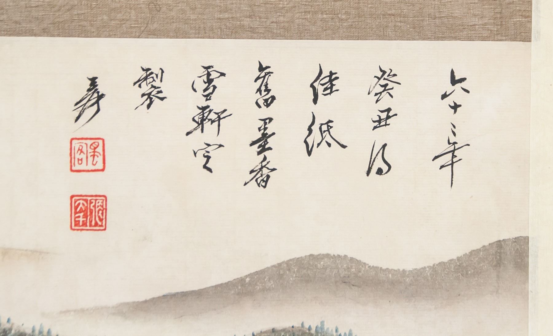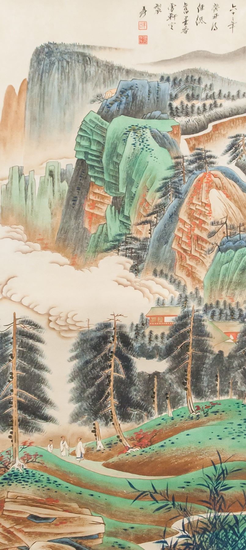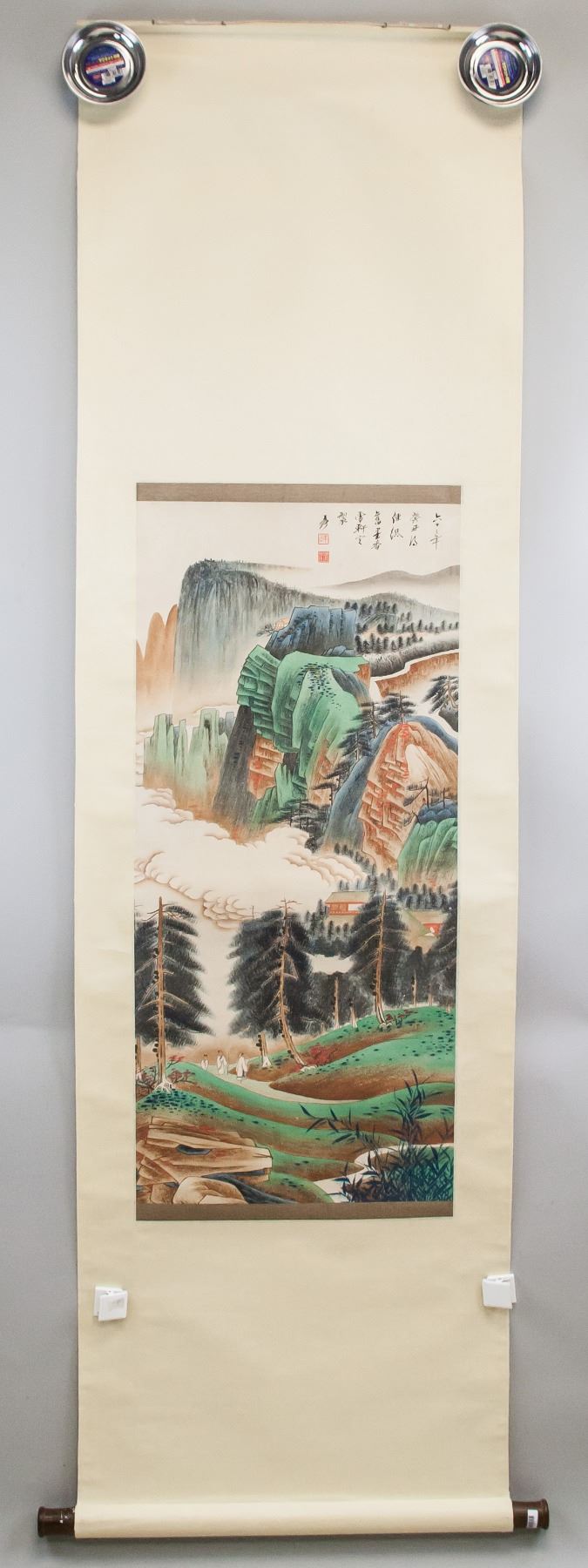 Chinese watercolor and ink on scroll. Featuring mountainous landscape with a few figures wandering through. Two artist stamps present. Attributed to Zhang Daqian (1899-1983, Chinese). 90 x 41 cm