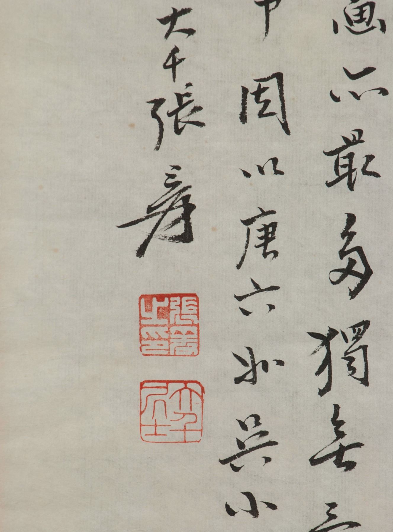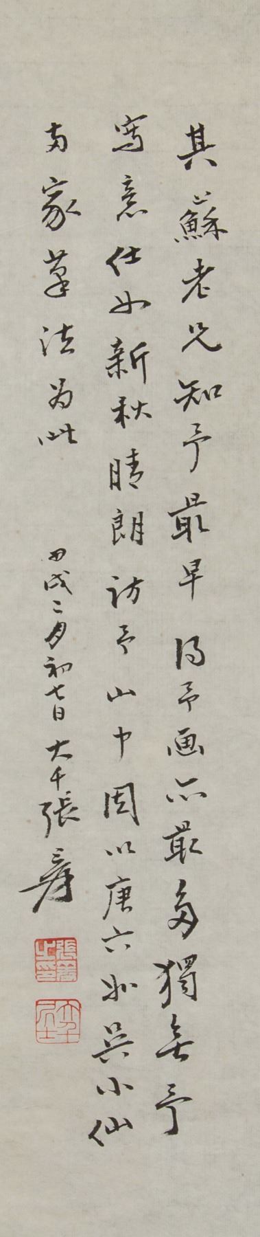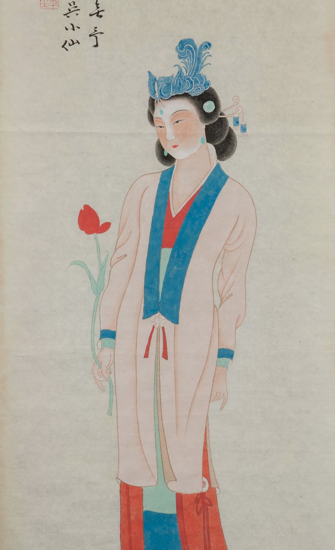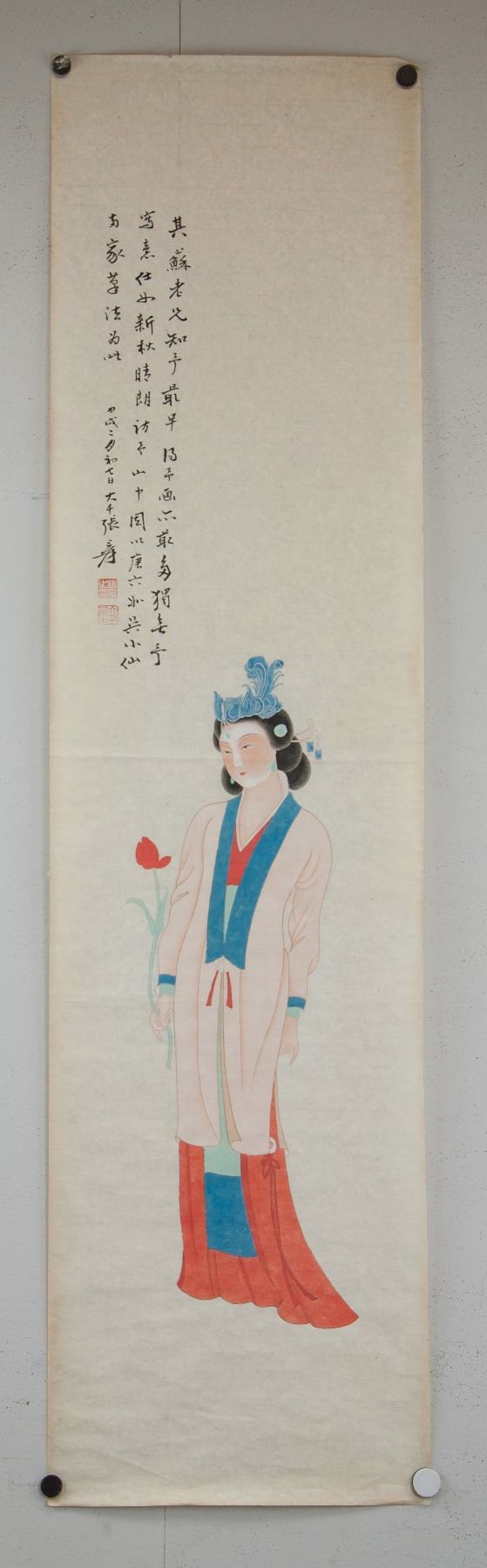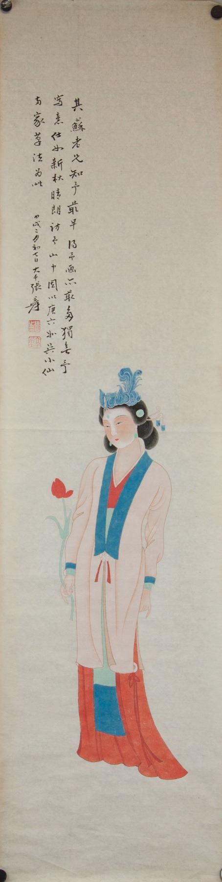 Painting of beauty; Chinese ink and watercolour on paper; signed Zhang Daqian (1899-1983); inscribed with 2 artist seals; 134 cm x 35 cm