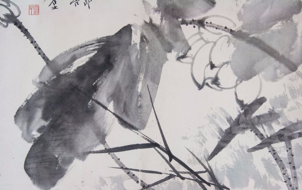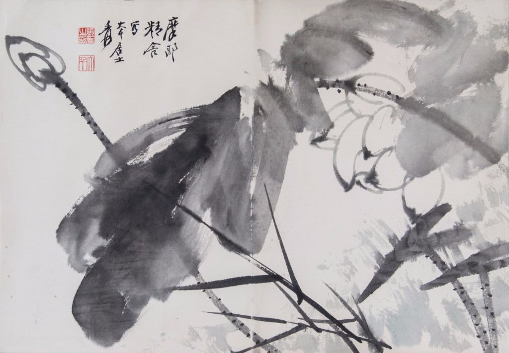 Painting of lotus; Chinese ink and watercolour on paper roll; signed Zhang Daqian (1899-1983); inscribed with 2 artist seal; 32 cm x 46 cm
