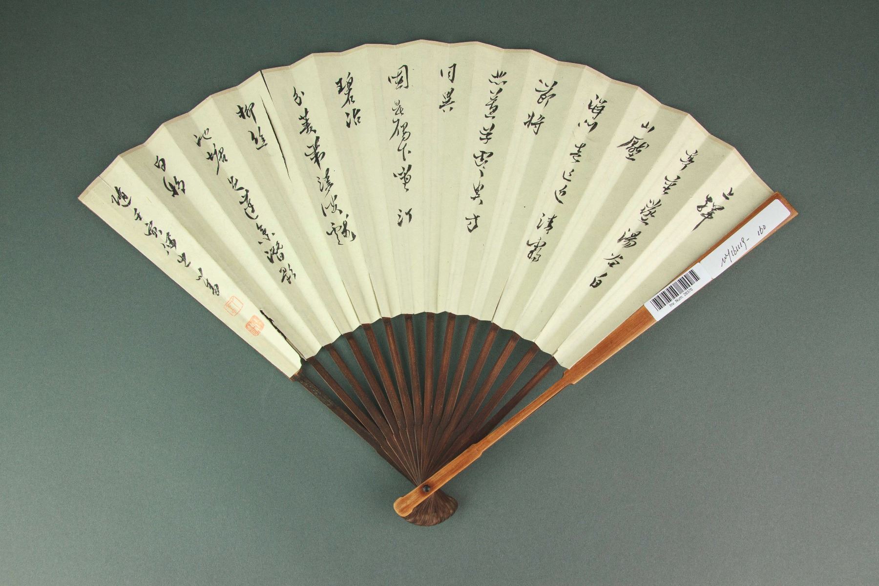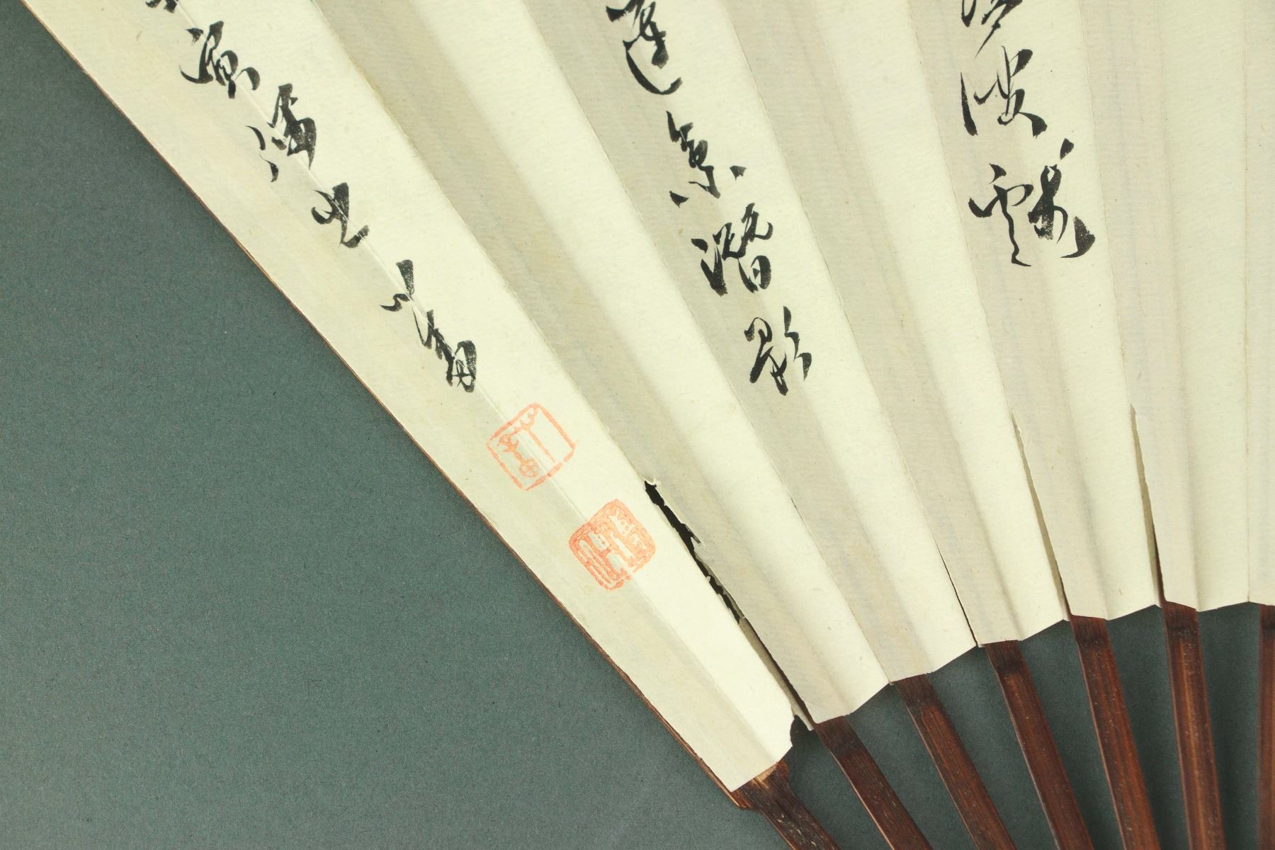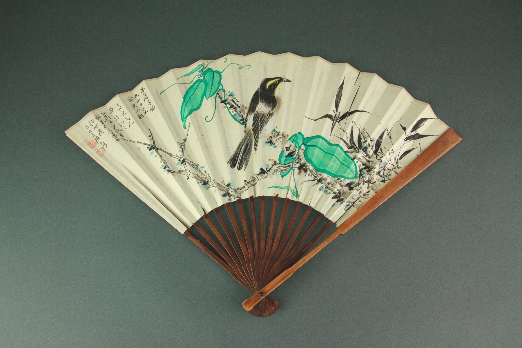 Chinese hwamei bird on plum tree and calligraphy in semi cursive script; Chinese ink and watercolour on fan; signed Zhang Daqian (1899-1983); inscribed with 4 artist seals; 18 cm × 47 cm