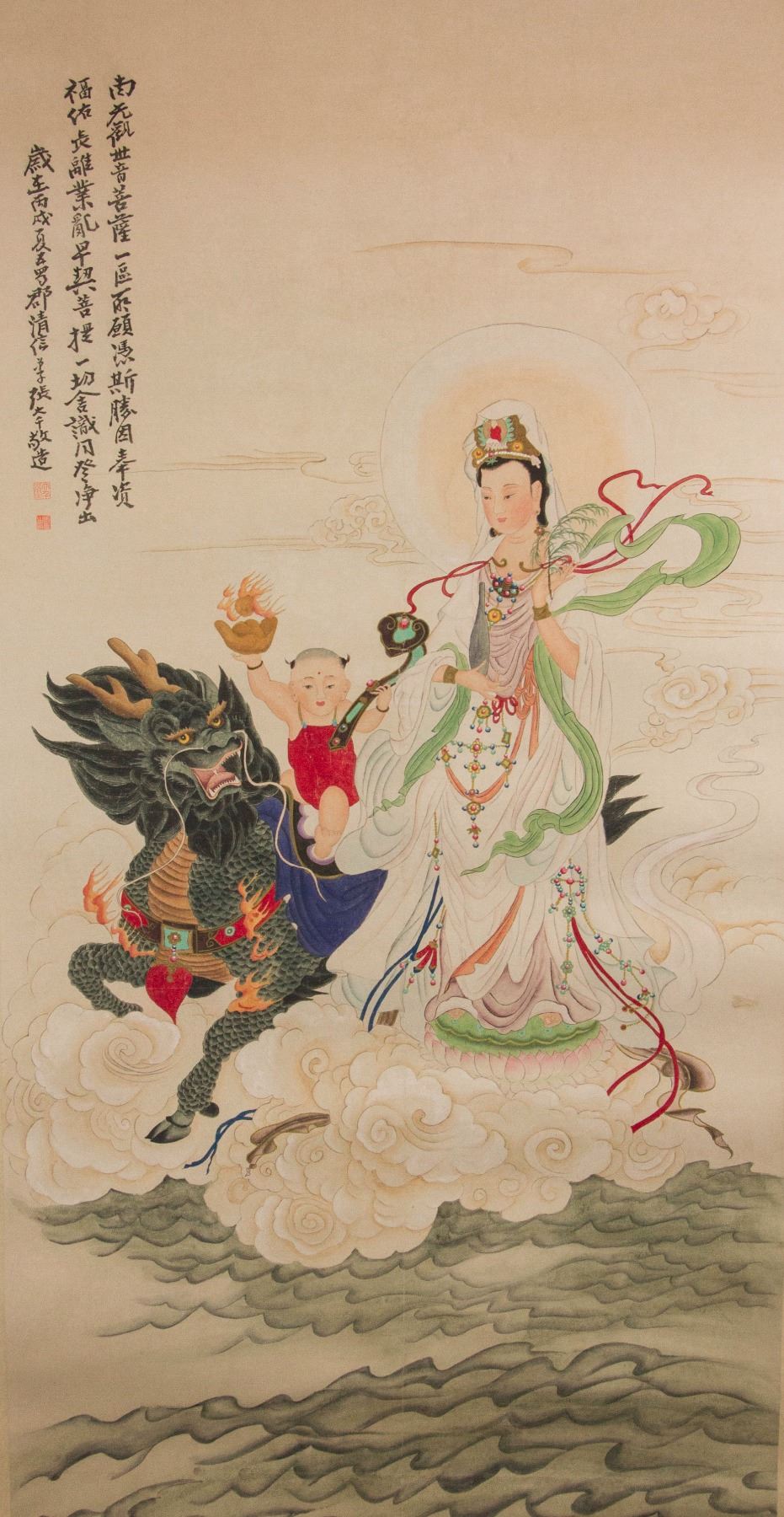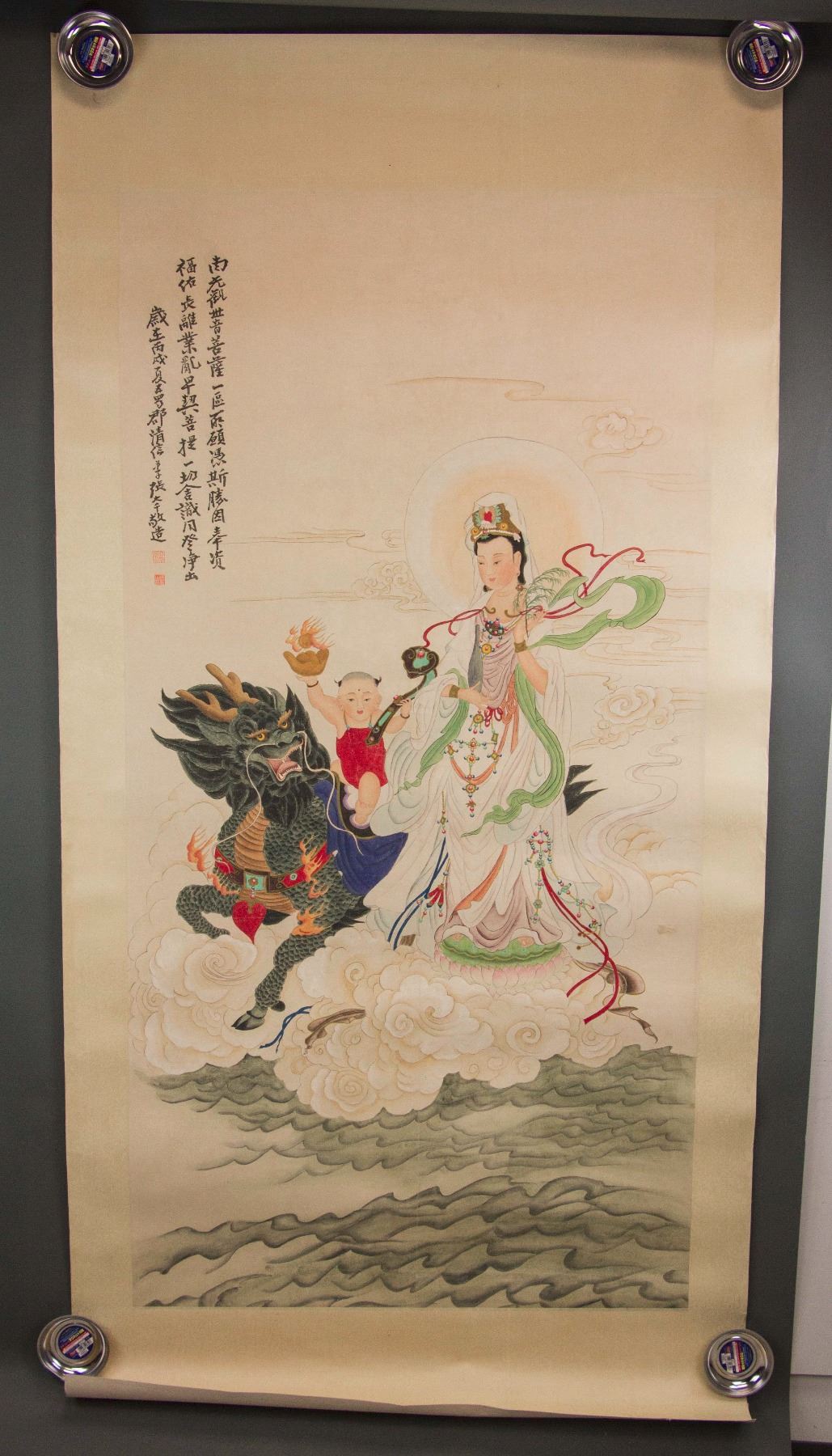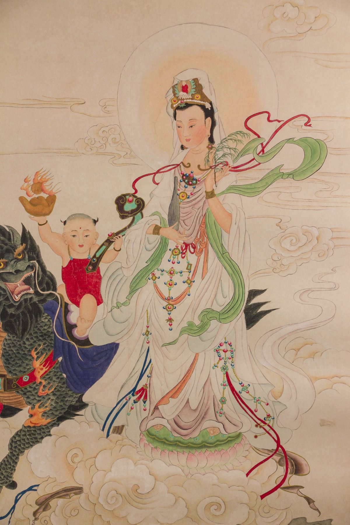 Painting of Guanyin, Shancai and Kirin; Chinese ink and watercolour on paper roll; signed Zhang Daqian (1899-1983); inscribed with 2 artist seals; 167 cm x 85 cm