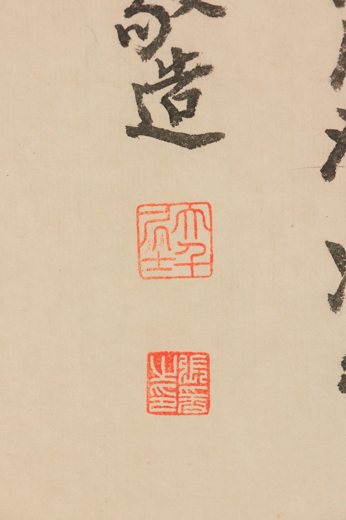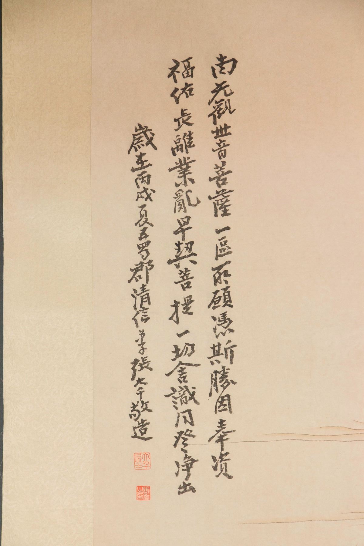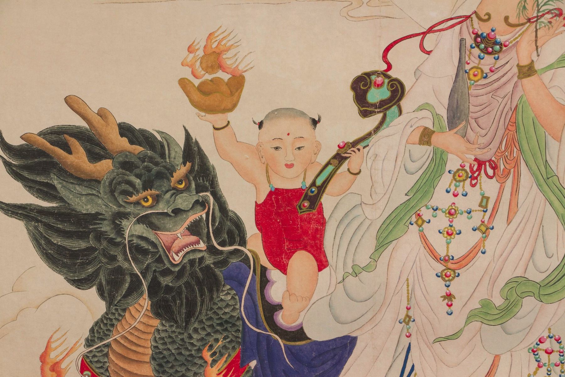 Painting of Guanyin, Shancai and Kirin; Chinese ink and watercolour on paper roll; signed Zhang Daqian (1899-1983); inscribed with 2 artist seals; 167 cm x 85 cm