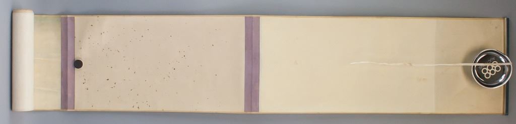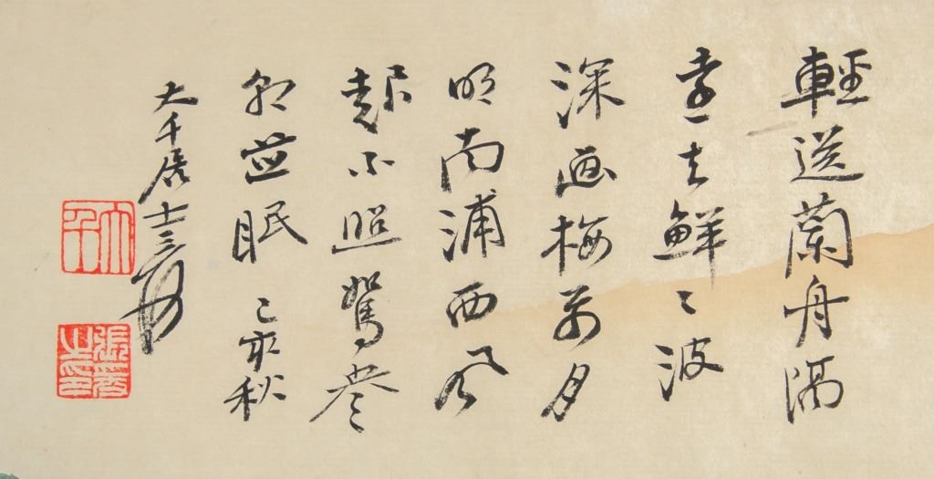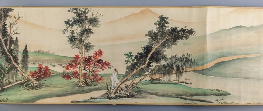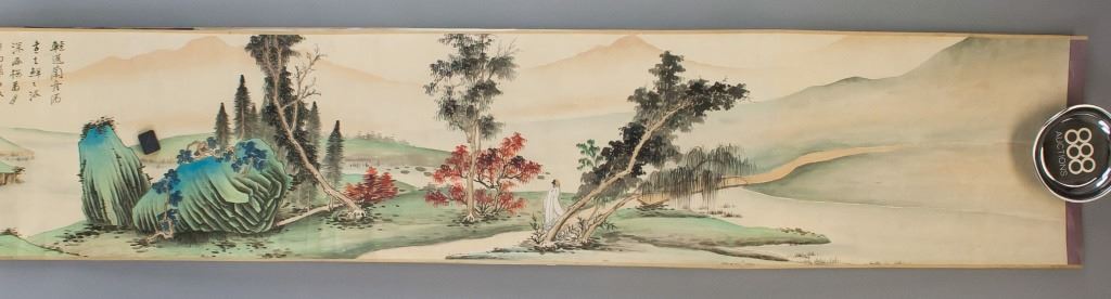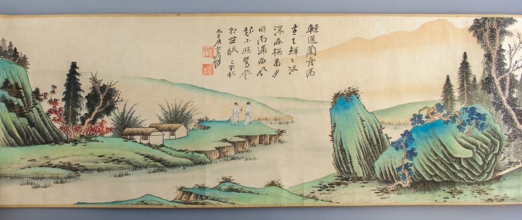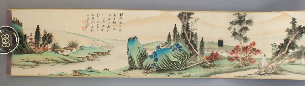 Chinese watercolor on paper. Featuring landscape scene. Signed "Da Qian" in Chinese characters. Inscriebed with two seals. Shop label attached. 26 x 158 cm.
