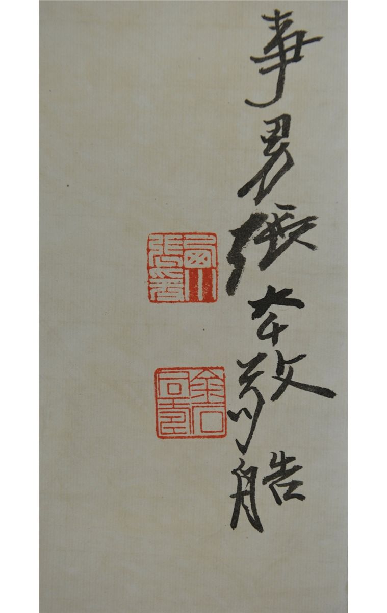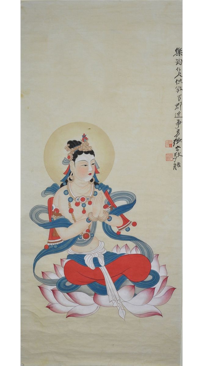 Chinese watercolour painting, ink on paper; signed Zhang Daqian; inscribed and signed with two seals; 129 cm x 58 cm