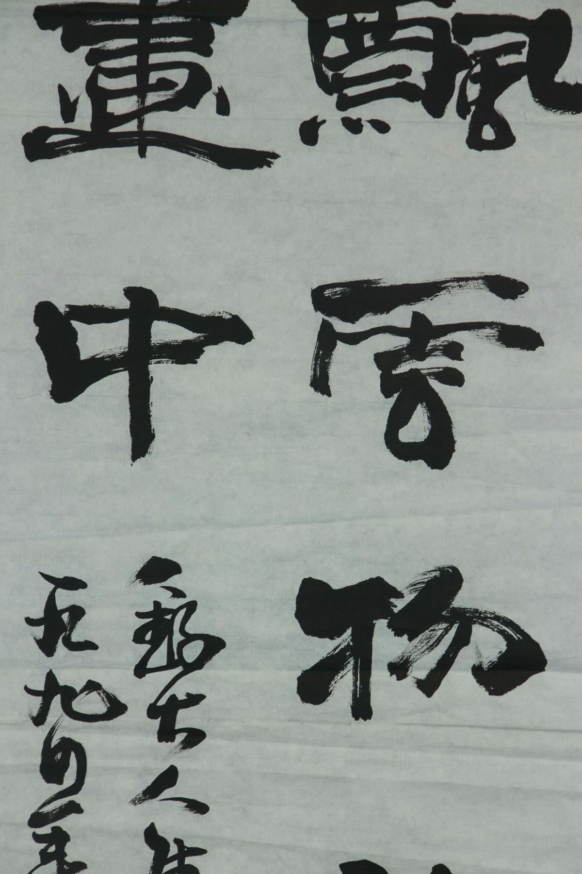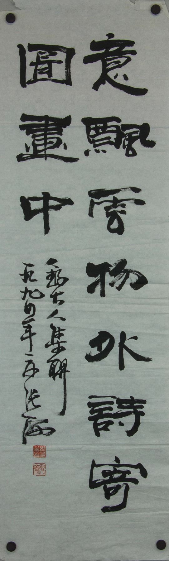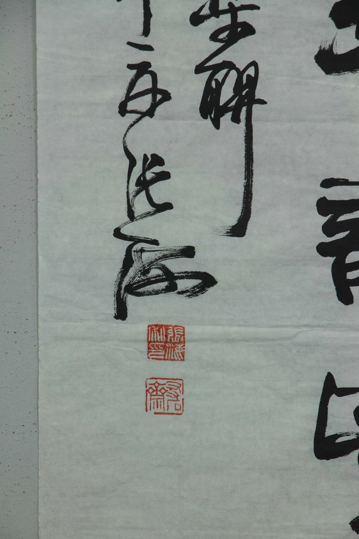 Chinese character calligraphy; Chinese ink on paper; signed Zhang Hai (b.1941); inscribed with 2 artist seals; 110 cm × 34 cm