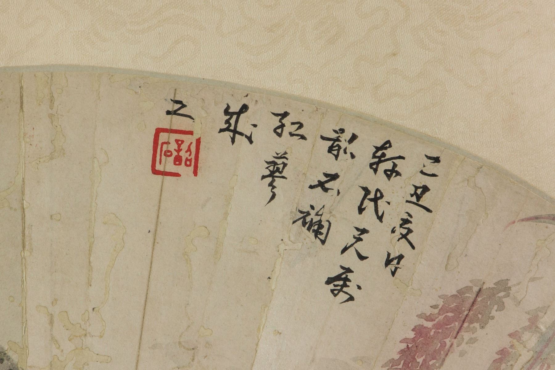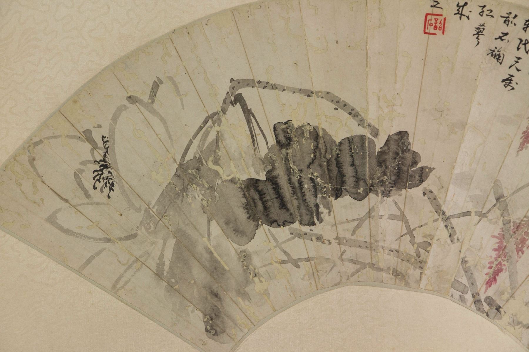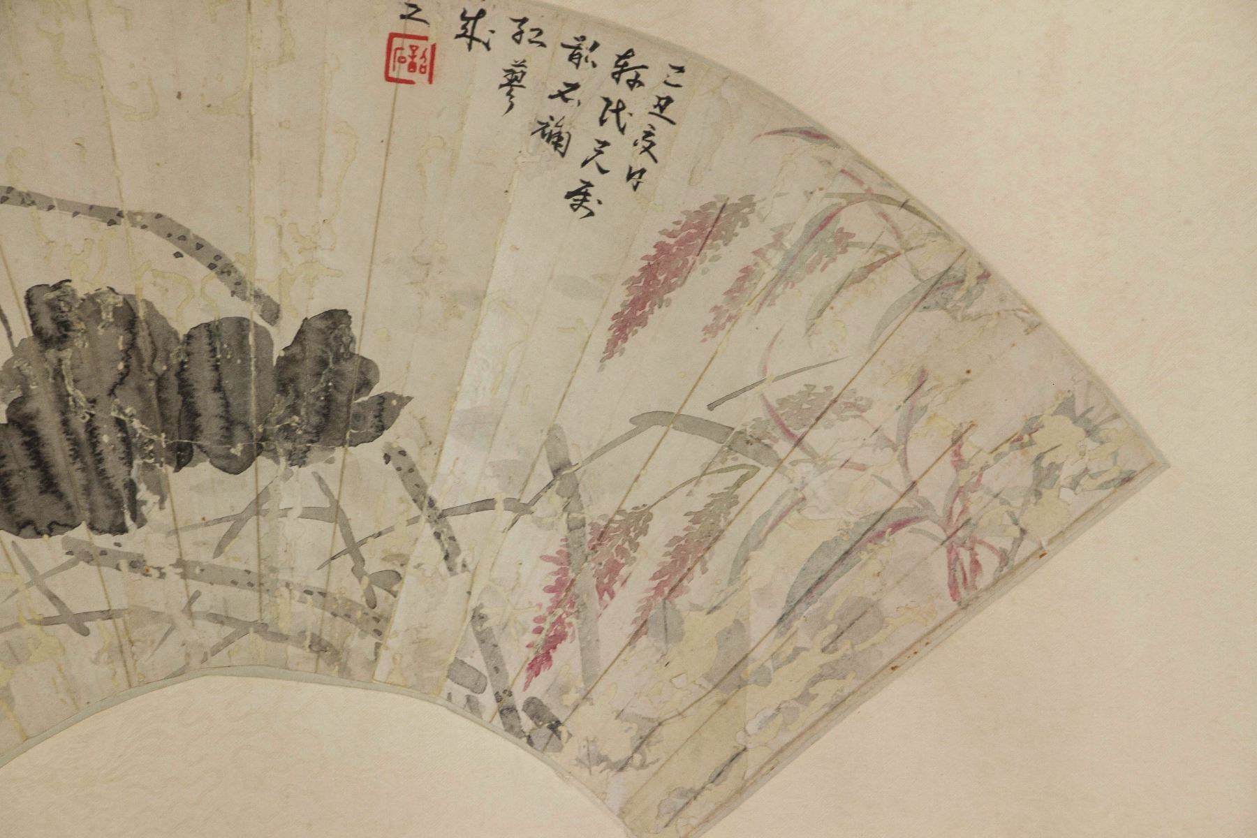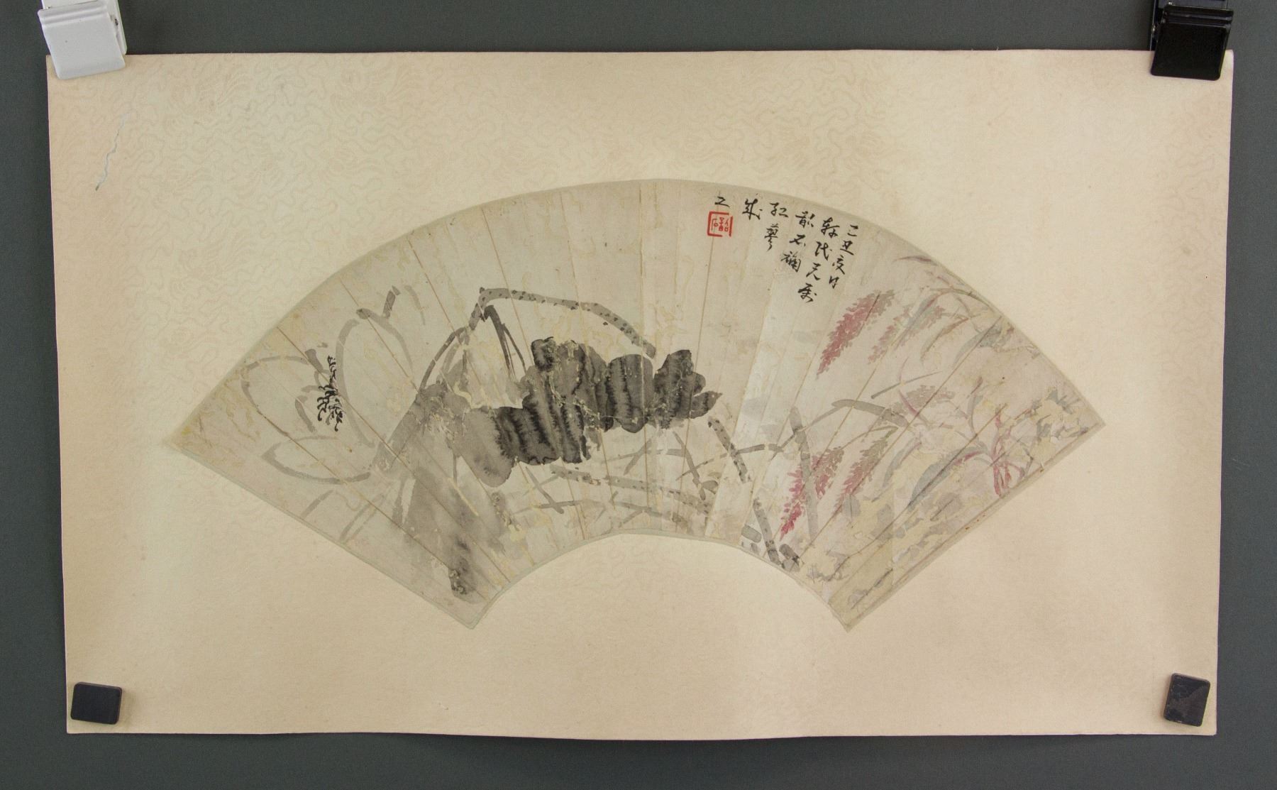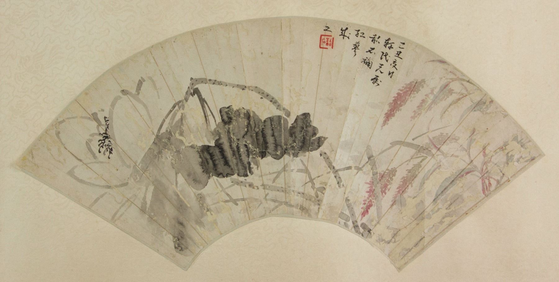 Still life painting of wheat and vegetables; Chinese ink and watercolour on fan shape paper; mounted on paper roll; signed Zhang Shaoshi (1913-1991); inscribed with 1 artists seal; 21.5 cm x 48.5 cm