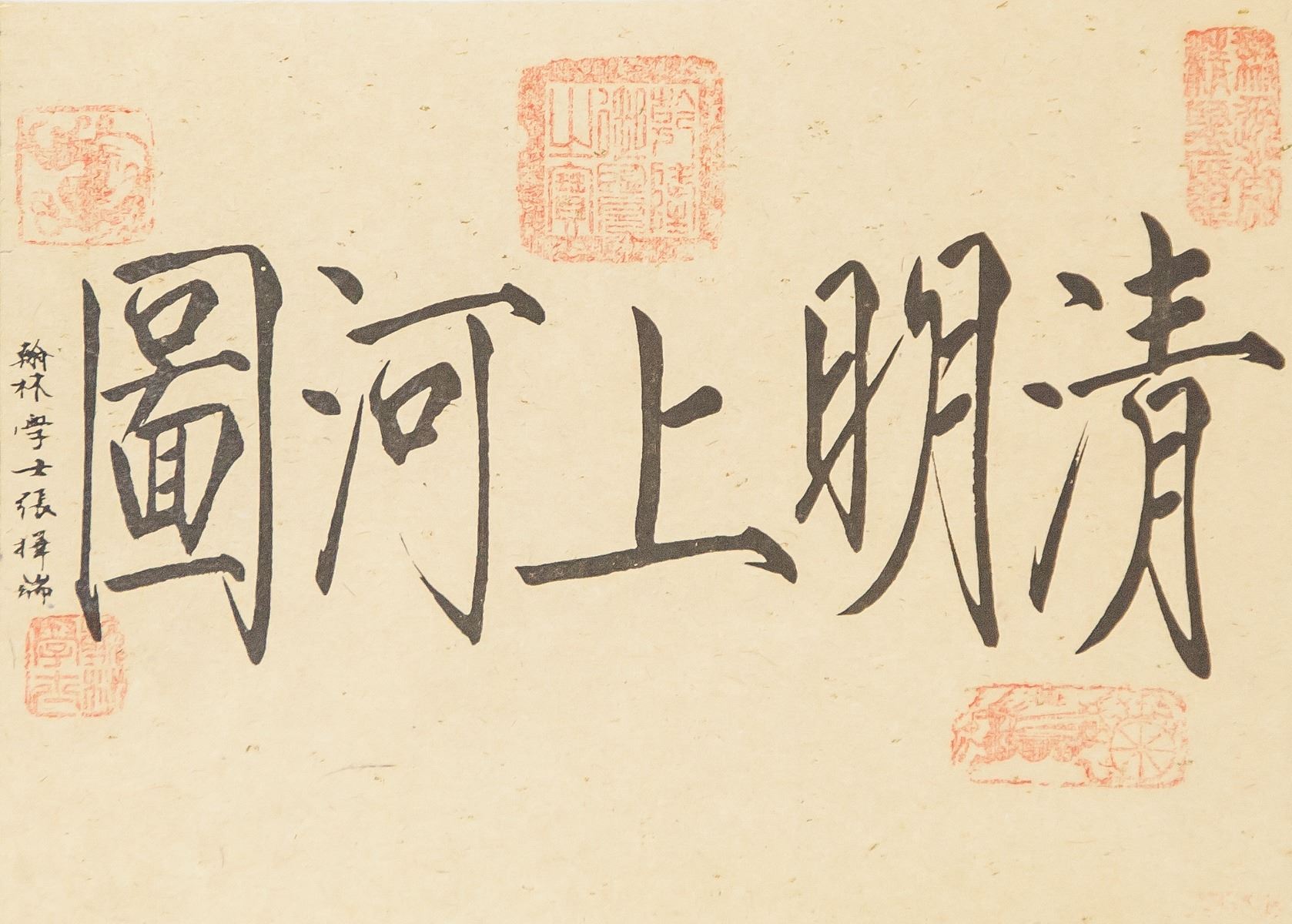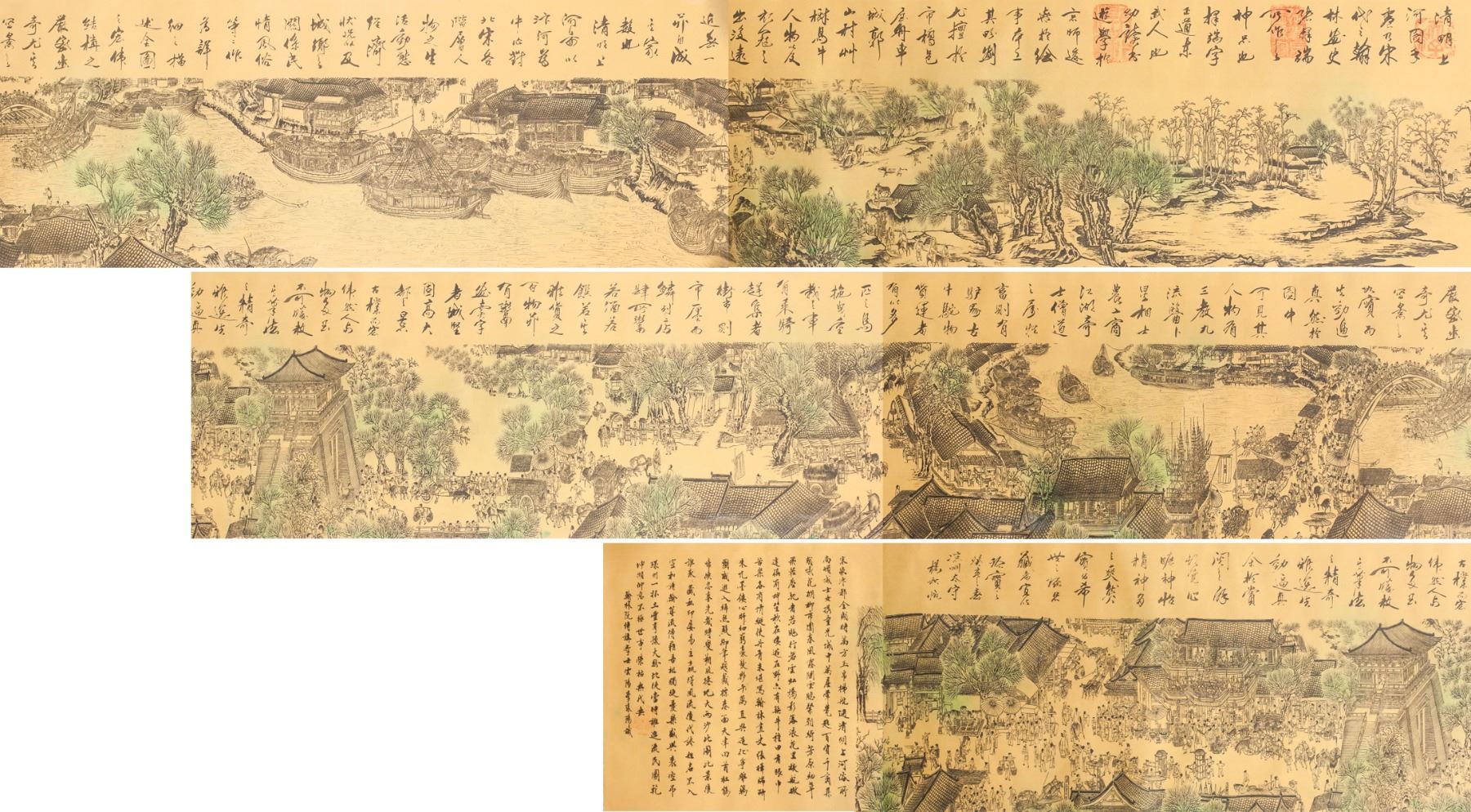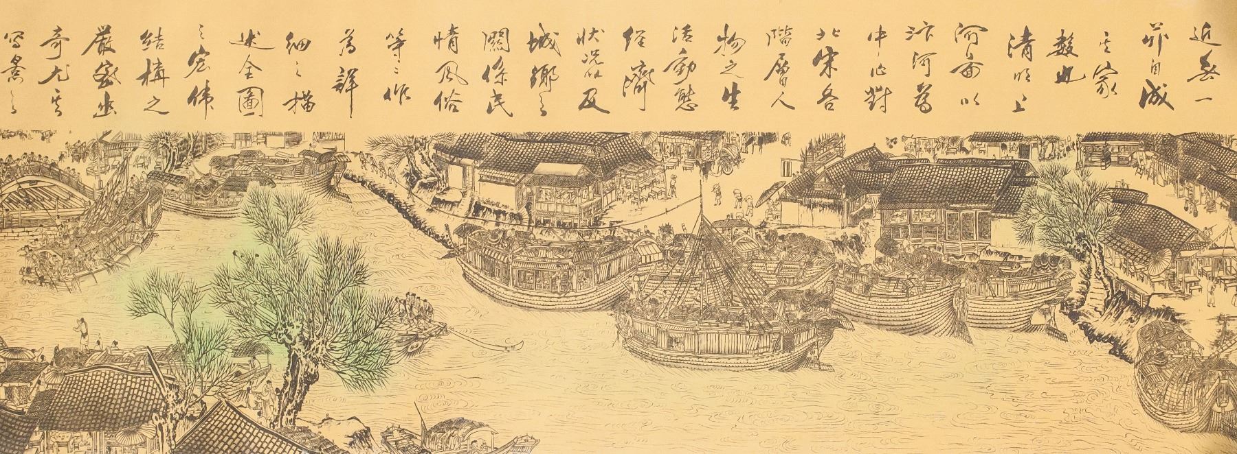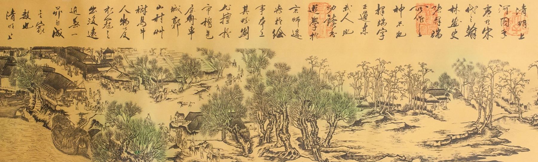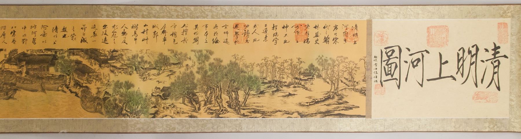 Lithograph on paper, horizontal scroll. Featuring the painting Along the River During the Qingming Festival. Originally painted by Zhang Zeduan (1085-1145, Chinese). 346 x 27 cm