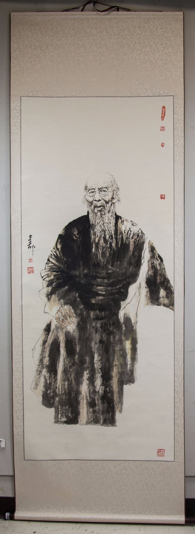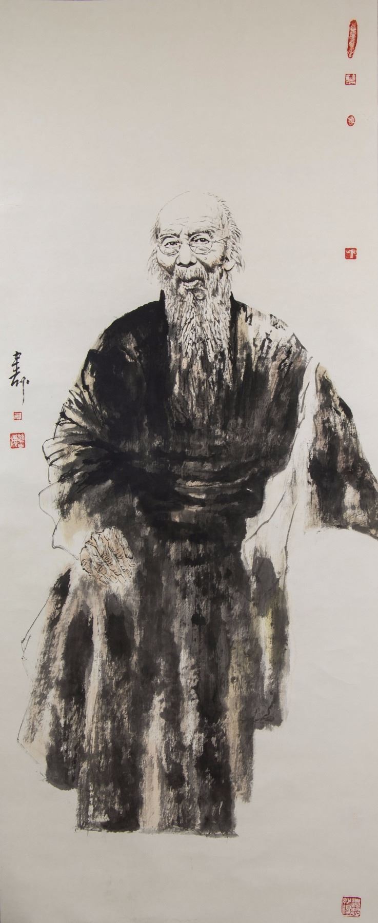 Portrait of Qi Baishi; Chinese ink and watercolour on paper; hanging scroll; signed Zhao Jiancheng (b.1949); inscribed with 7 artist seals; 163 cm x 68 cm
