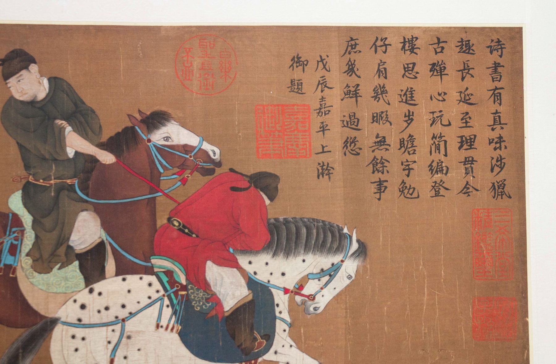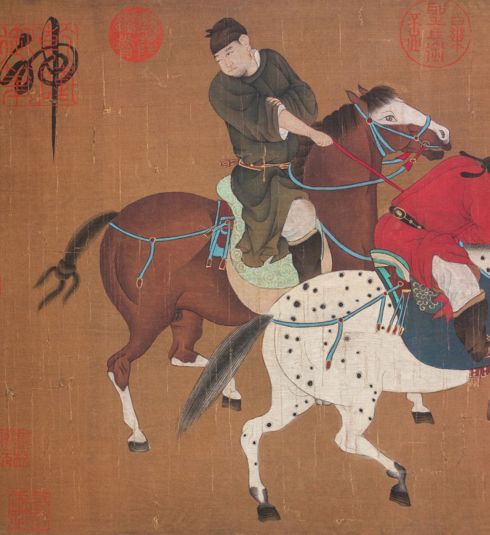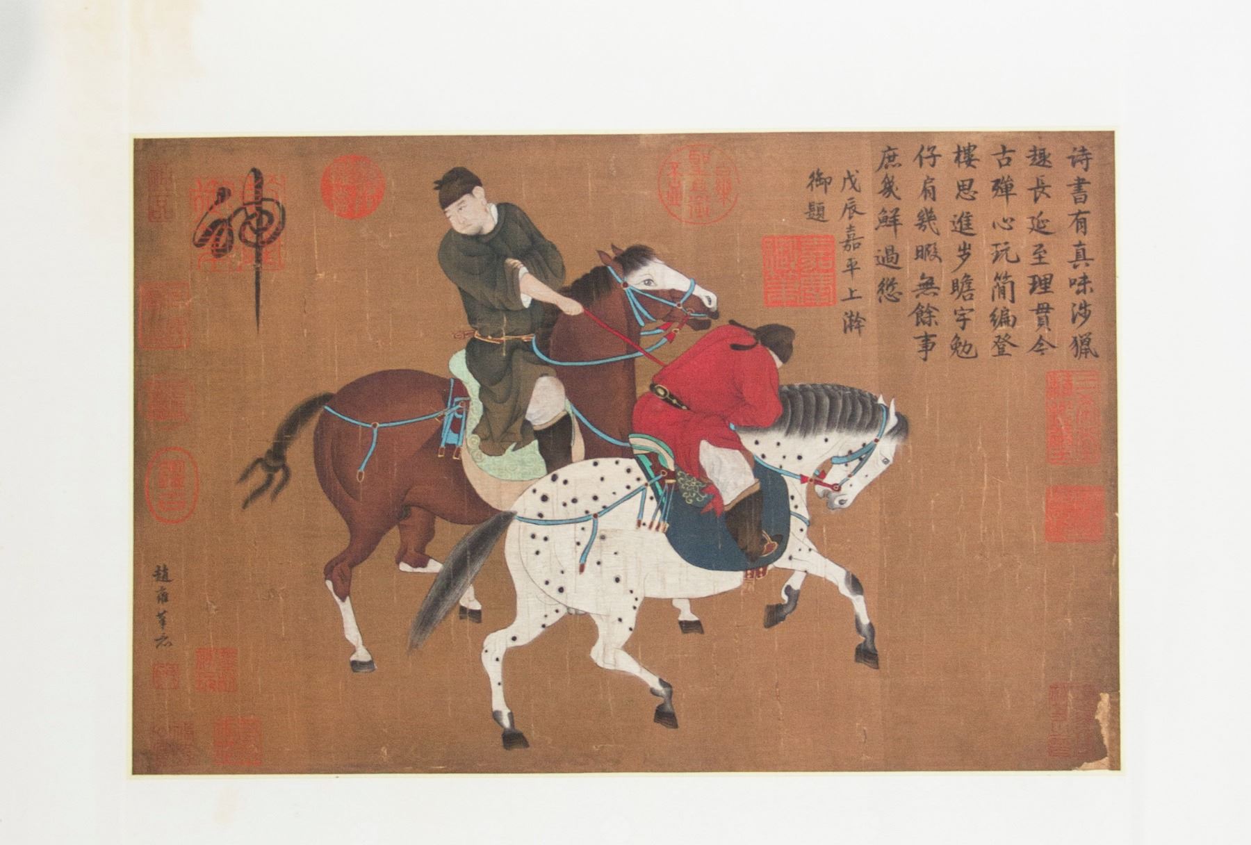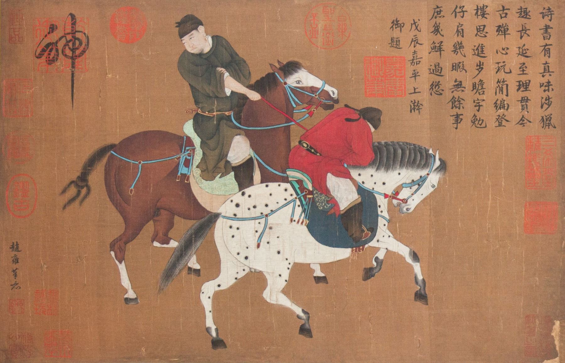 Painting of two officers riding on horses; Chinese ink and watercolour on silk roll; signed Zhao Mengfu (1254-1322); inscribed with 1 artist seal; with comment written by Emperor Jiaqing (1760-1820); inscribed with 14 collector's seals; 28 cm x 43 cm