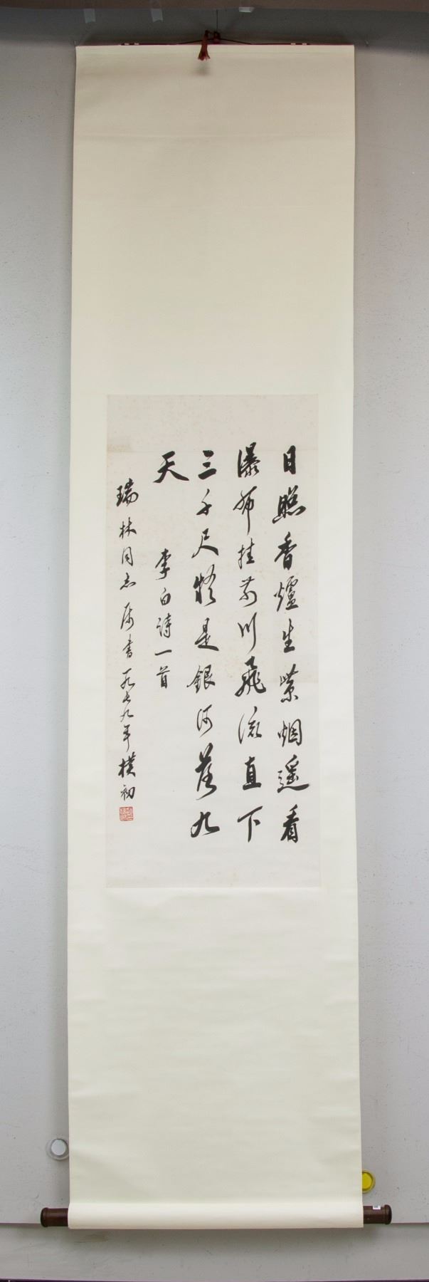 Chinese calligraphy of poem in semi-cursive script; Chinese ink and paper; hanging scroll; signed Zhao Puchu (1907-2000); inscribed with 1 artist seal; 86 cm x 37 cm