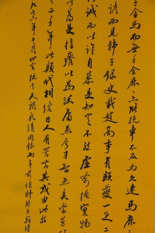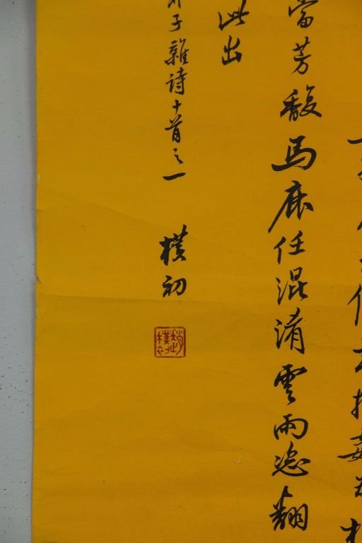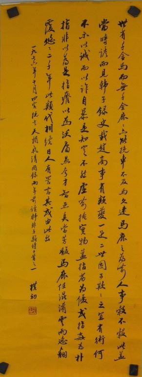 Chinese character calligraphy of Han Feizi poetry in xinshu; Chinese ink on yellow paper; signed Zhao Puchu (1907-2000); inscribed with 1 artist seal; 88 cm × 33 cm