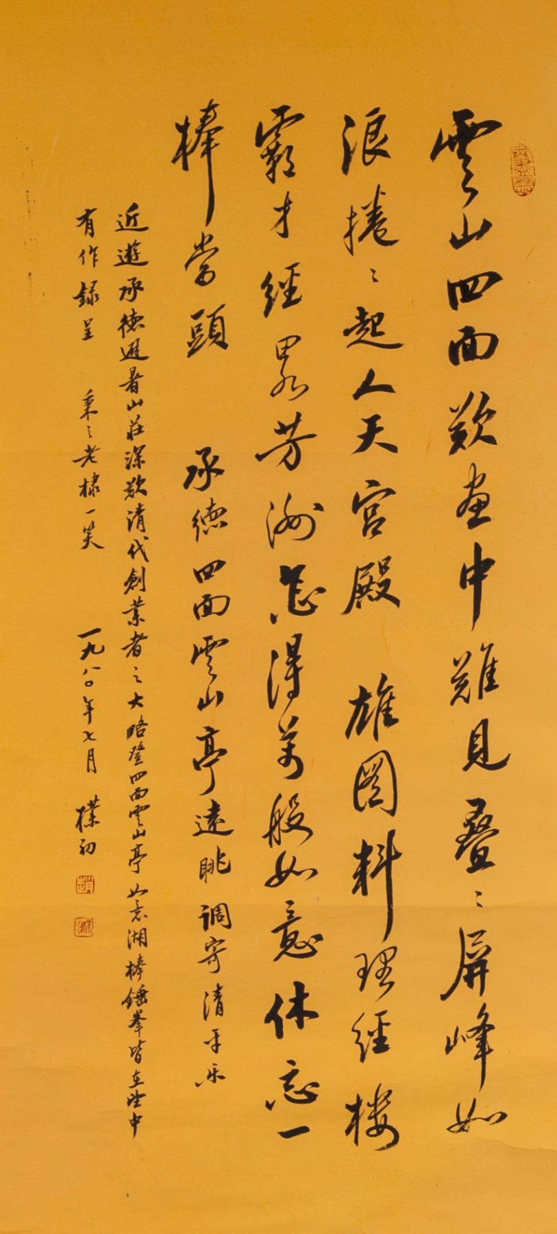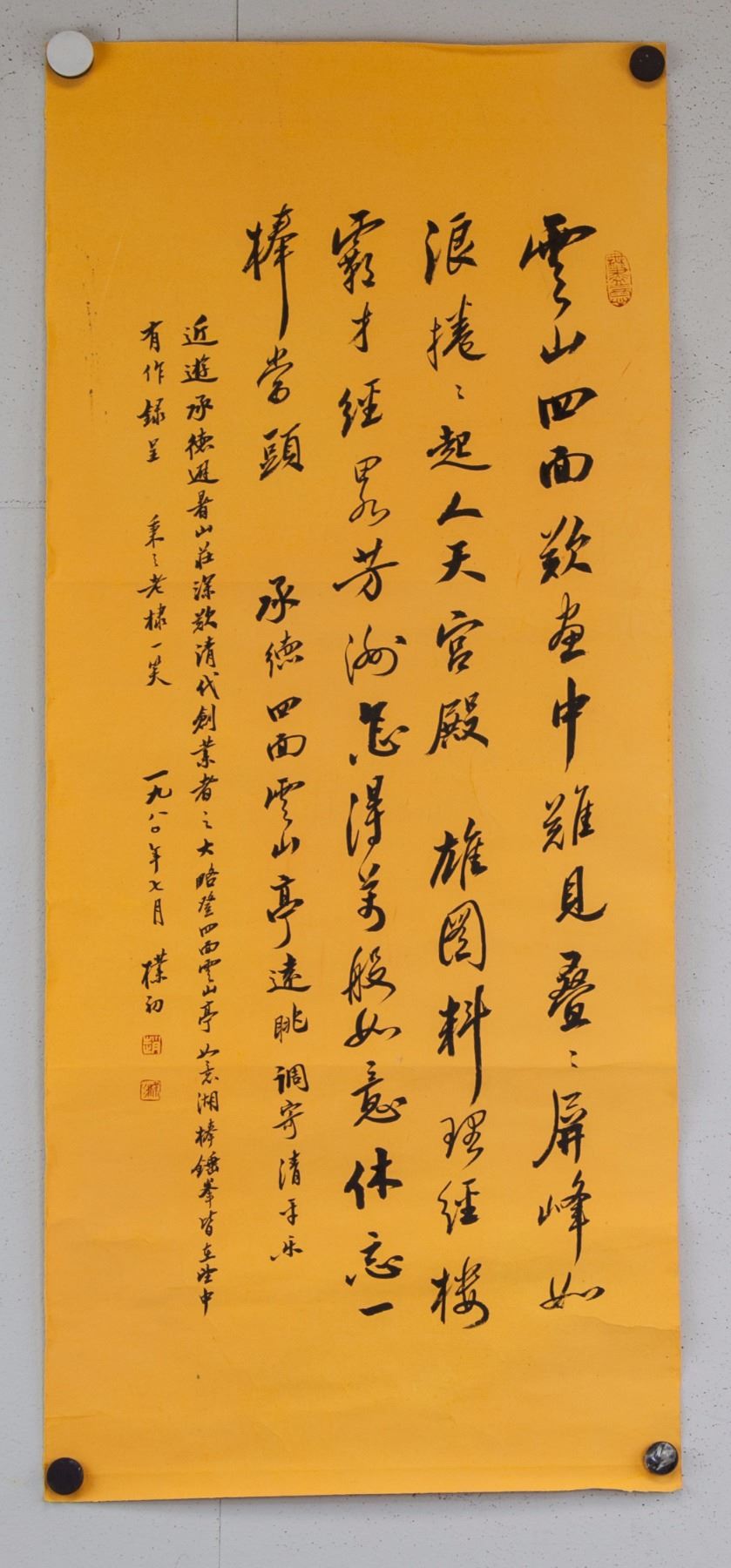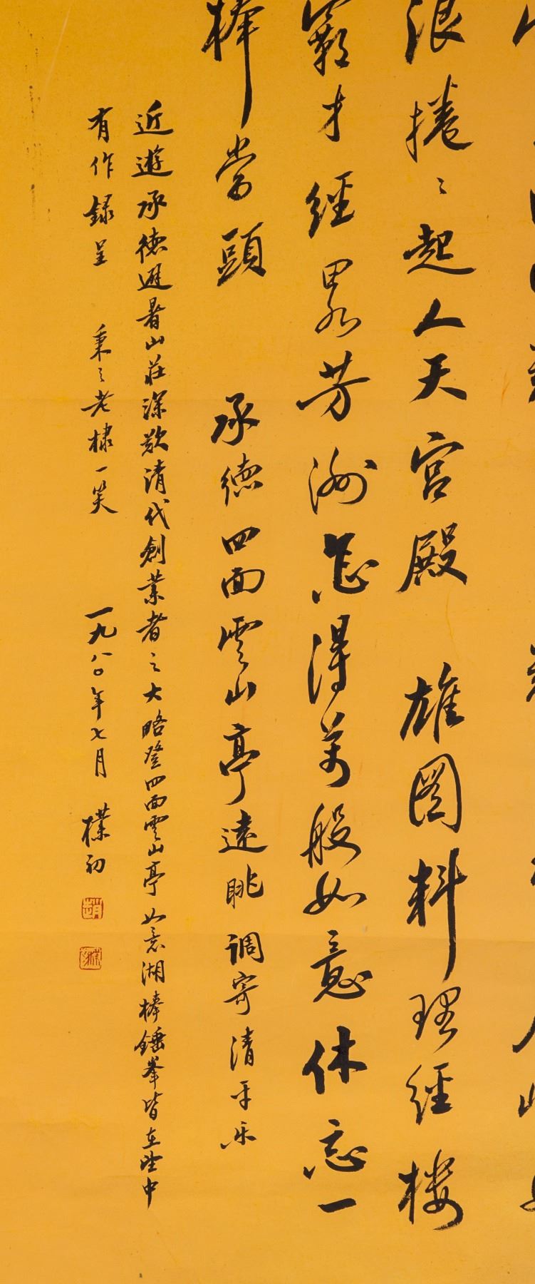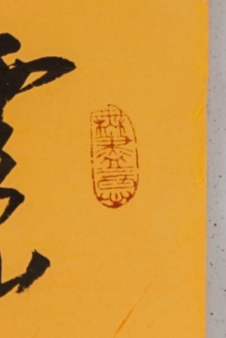 Chinese calligraphy in semi-cursive script; Chinese ink on yellow paper; signed Zhao Puchu (1907-2000); inscribed with 3 artist seals; 78 cm x 34 cm