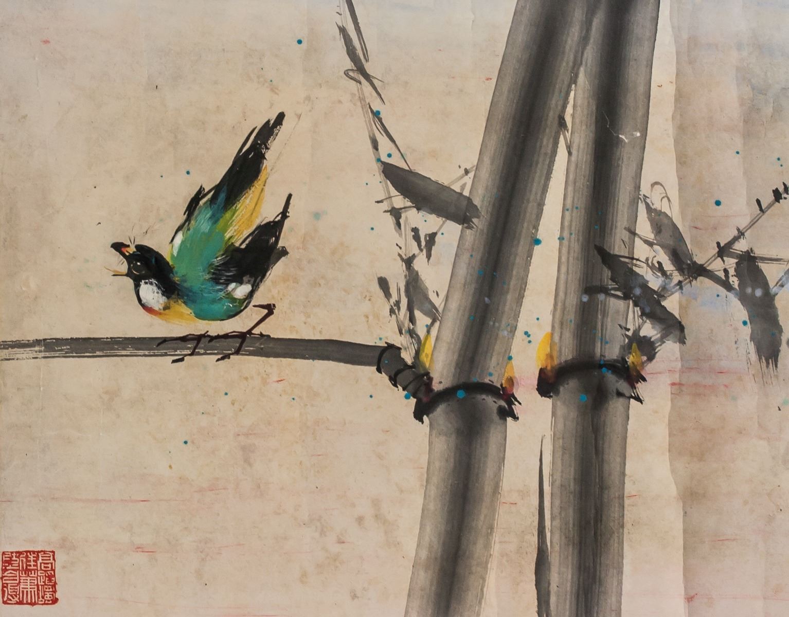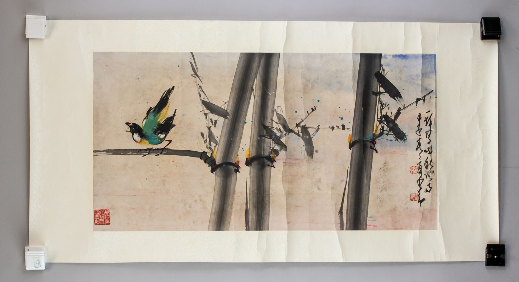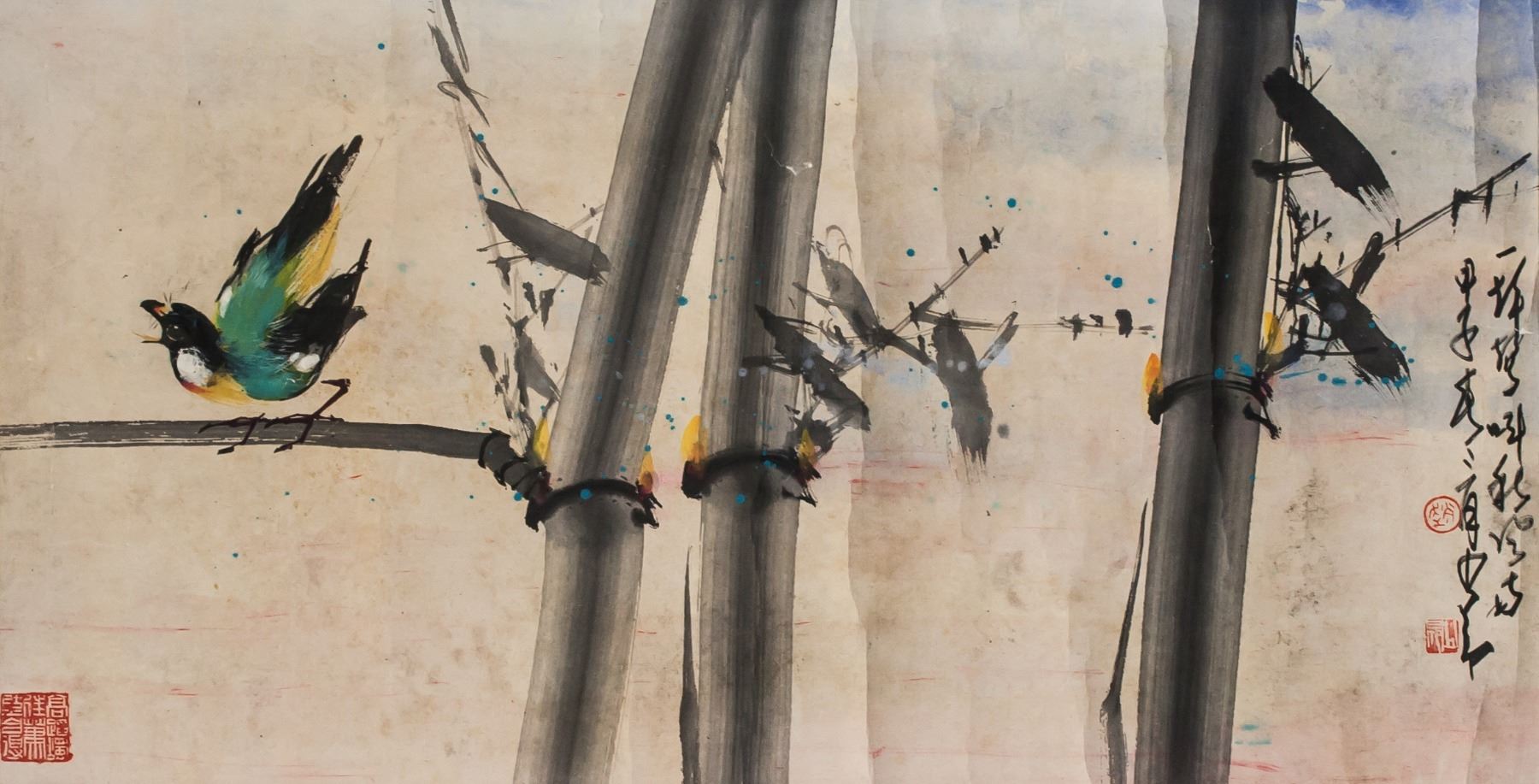 Ink and watercolor on paper roll. Featuring bird and bamboo. Signed Zhao Shao'ang (1905-1998, Chinese), inscribed with 3 seals. 33 x 63.5 cm