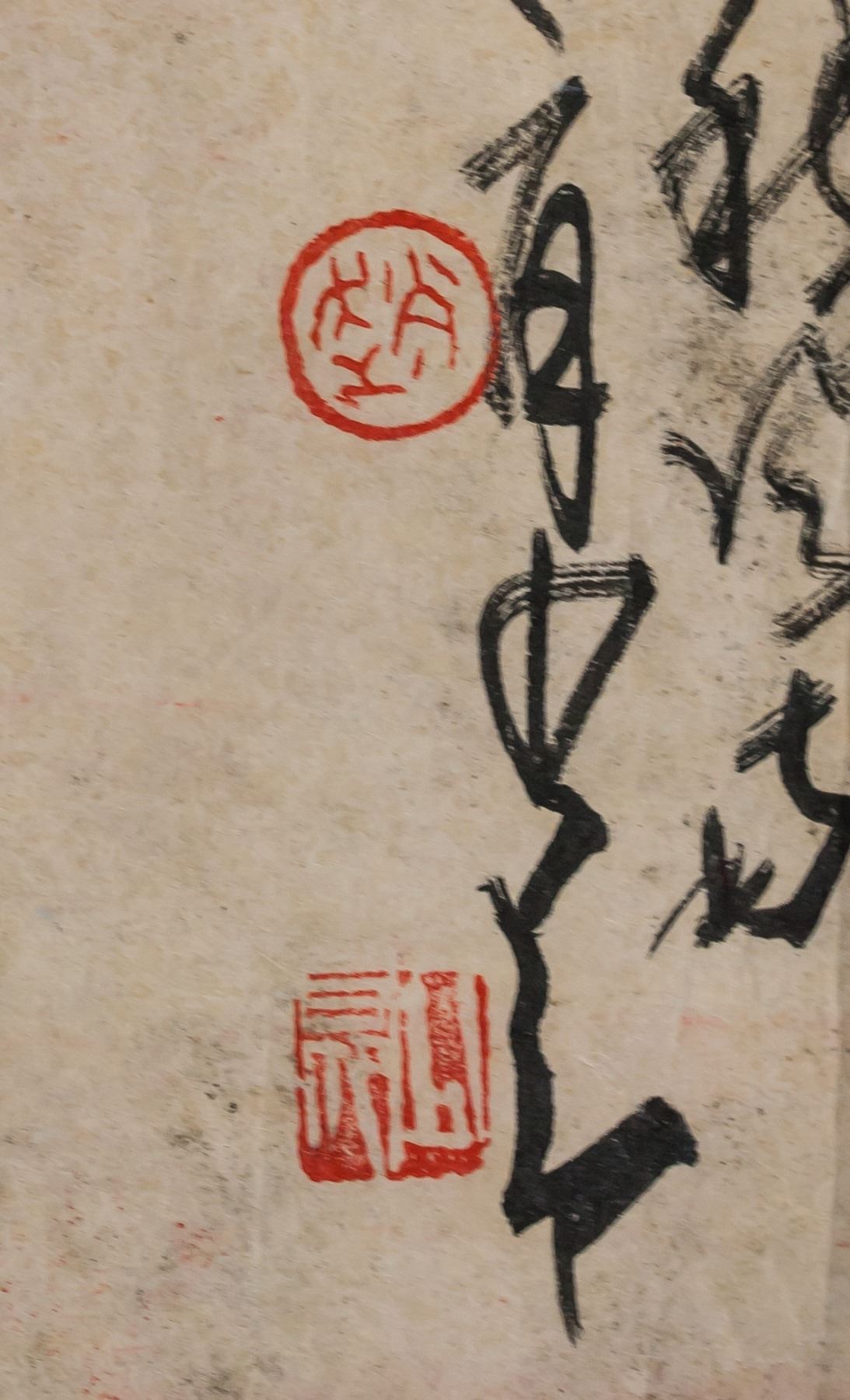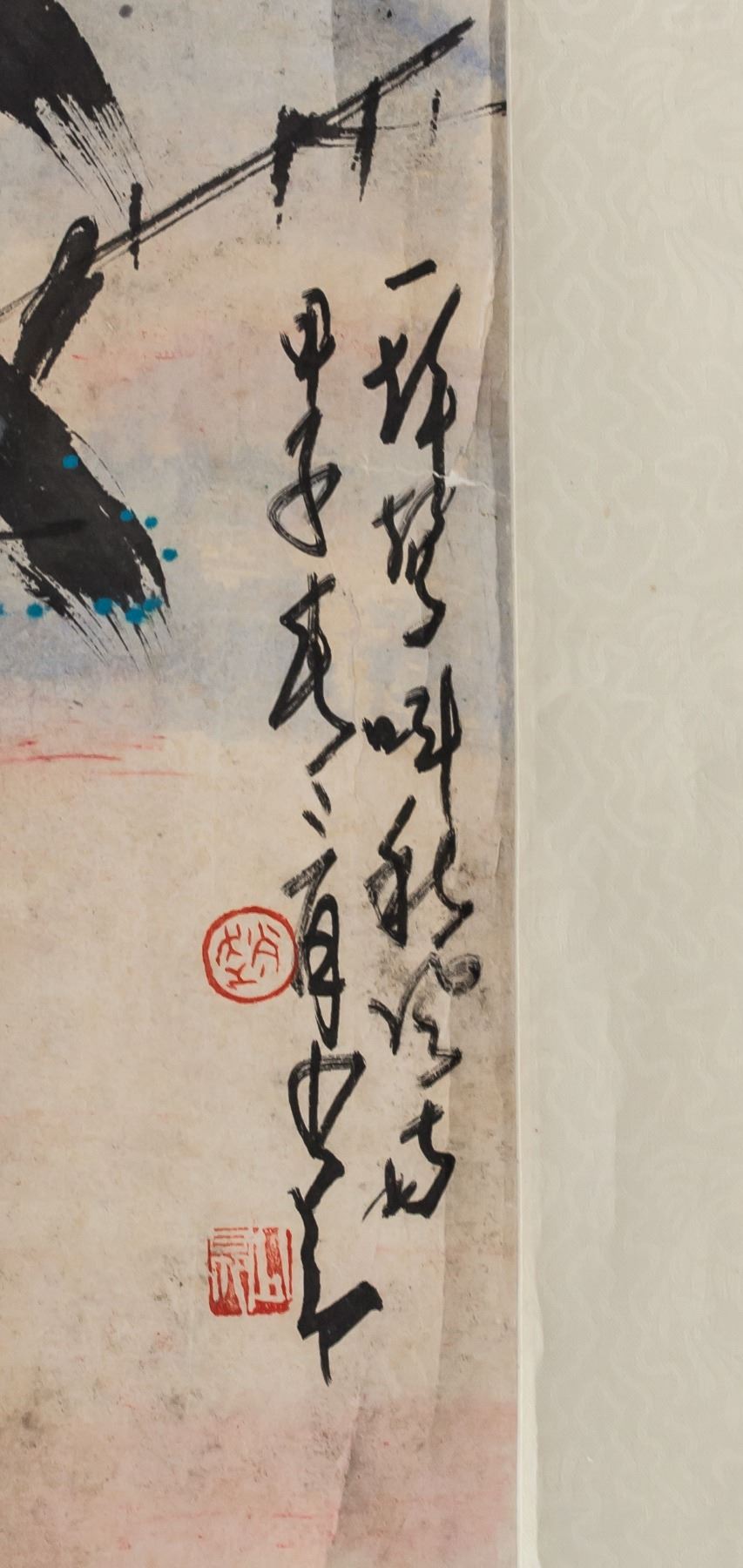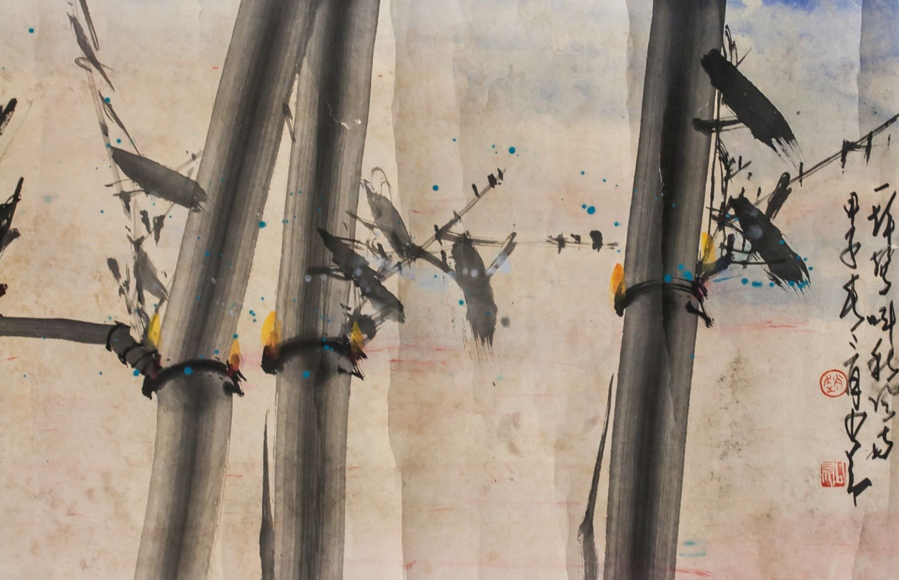Ink and watercolor on paper roll. Featuring bird and bamboo. Signed Zhao Shao'ang (1905-1998, Chinese), inscribed with 3 seals. 33 x 63.5 cm