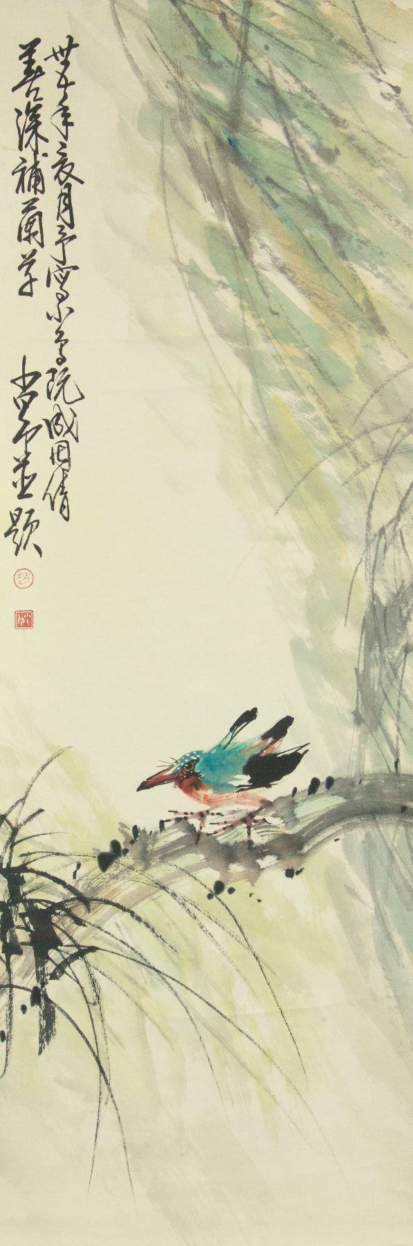 Kingfisher on willow tree; Chinese ink and watercolour on paper; hanging scroll; signed Zhao Shaoang (1905-1998); inscribed with 2 artist seals; 94 cm × 33 cm