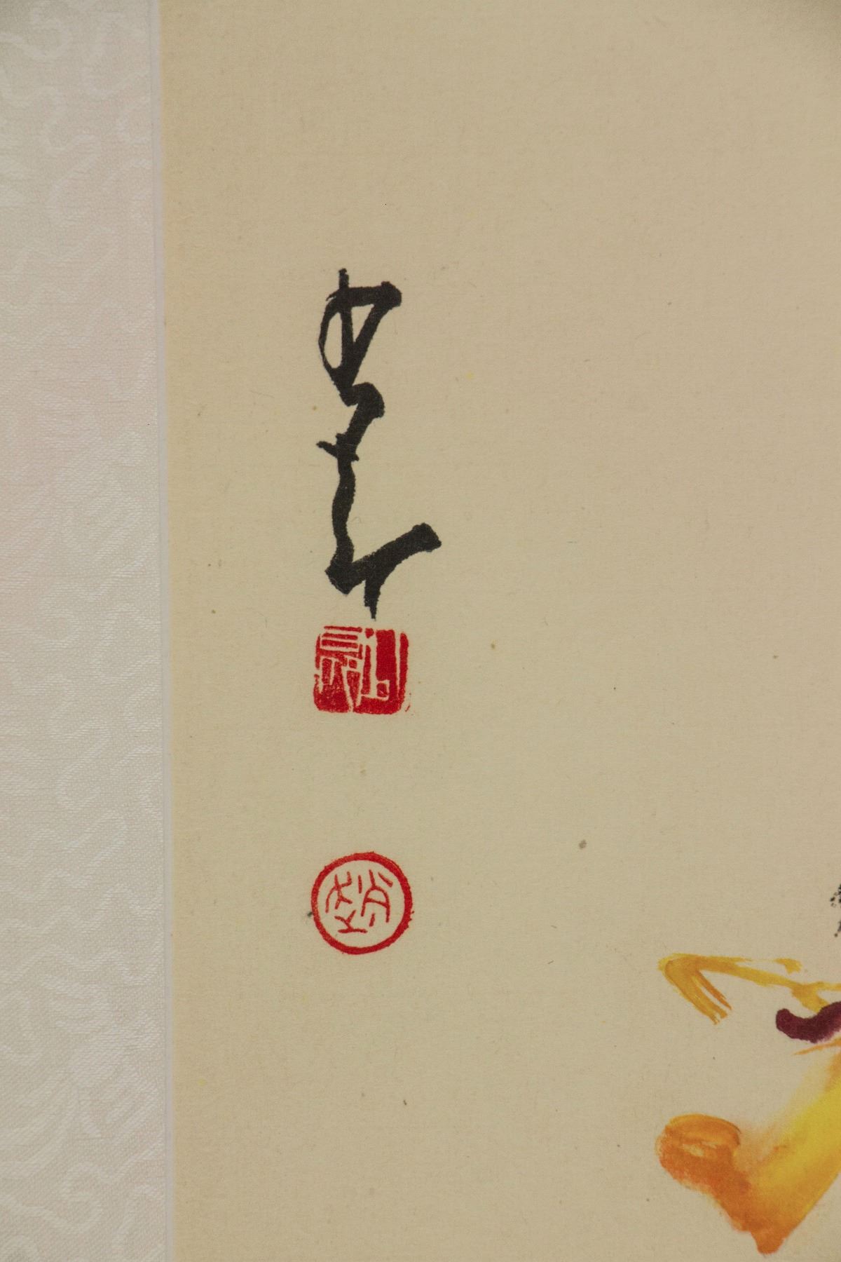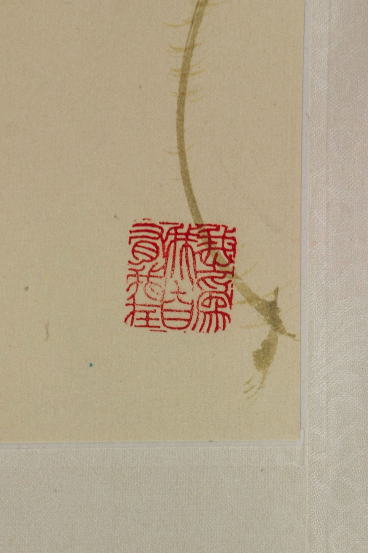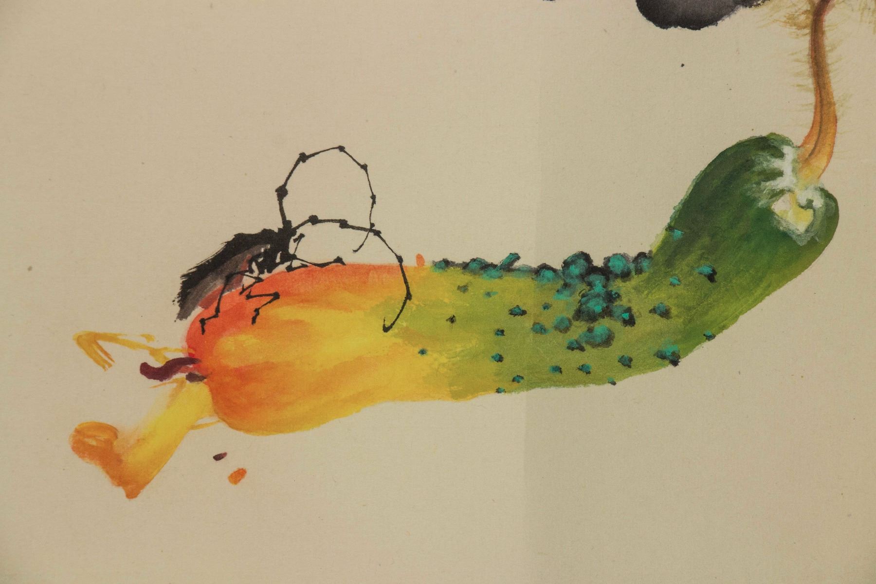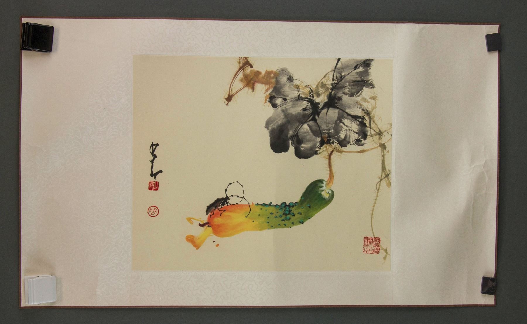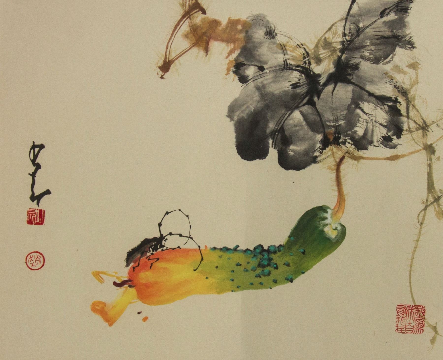 Painting of luffa and longhorn beetle; Chinese ink and watercolour on paper roll; signed Zhao Shaoang (1905-1998); inscribed with 3 artist seals; 30 cm x 36 cm